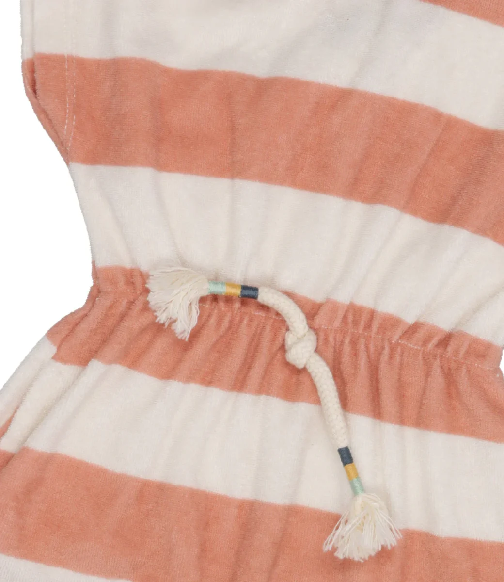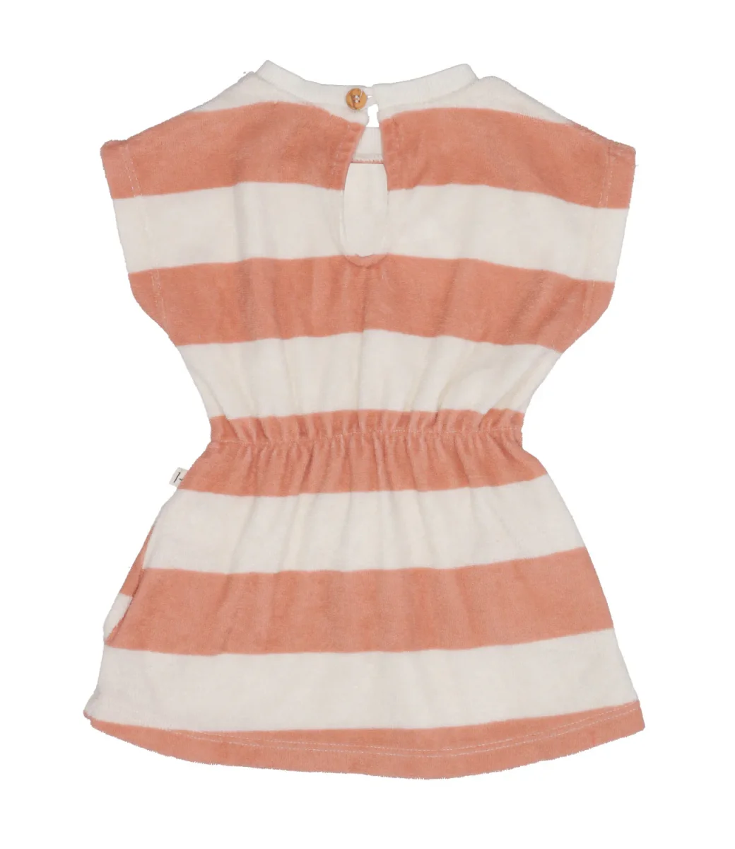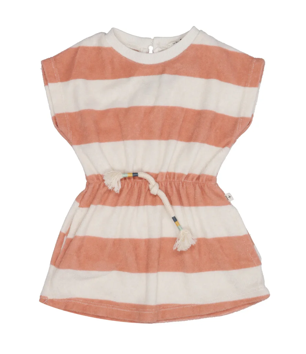 Abito 1+ in the Family realizzato in ciniglia di cotone, con fantasia a fasce larghe orizzontali bicolor,. Tessuti morbidi e naturali per accompagnare la crescita dei vostri bambini.