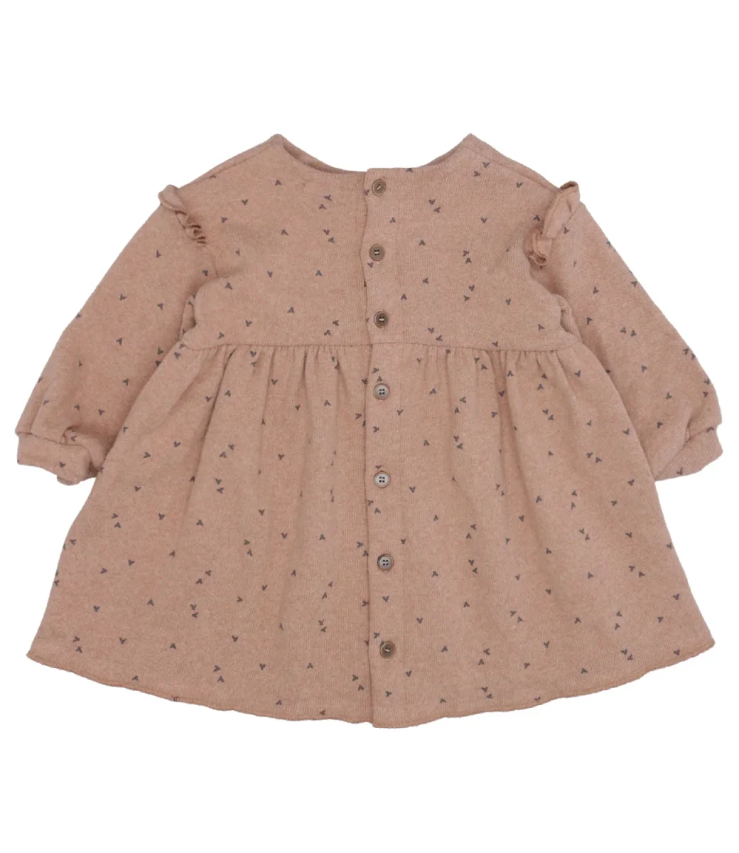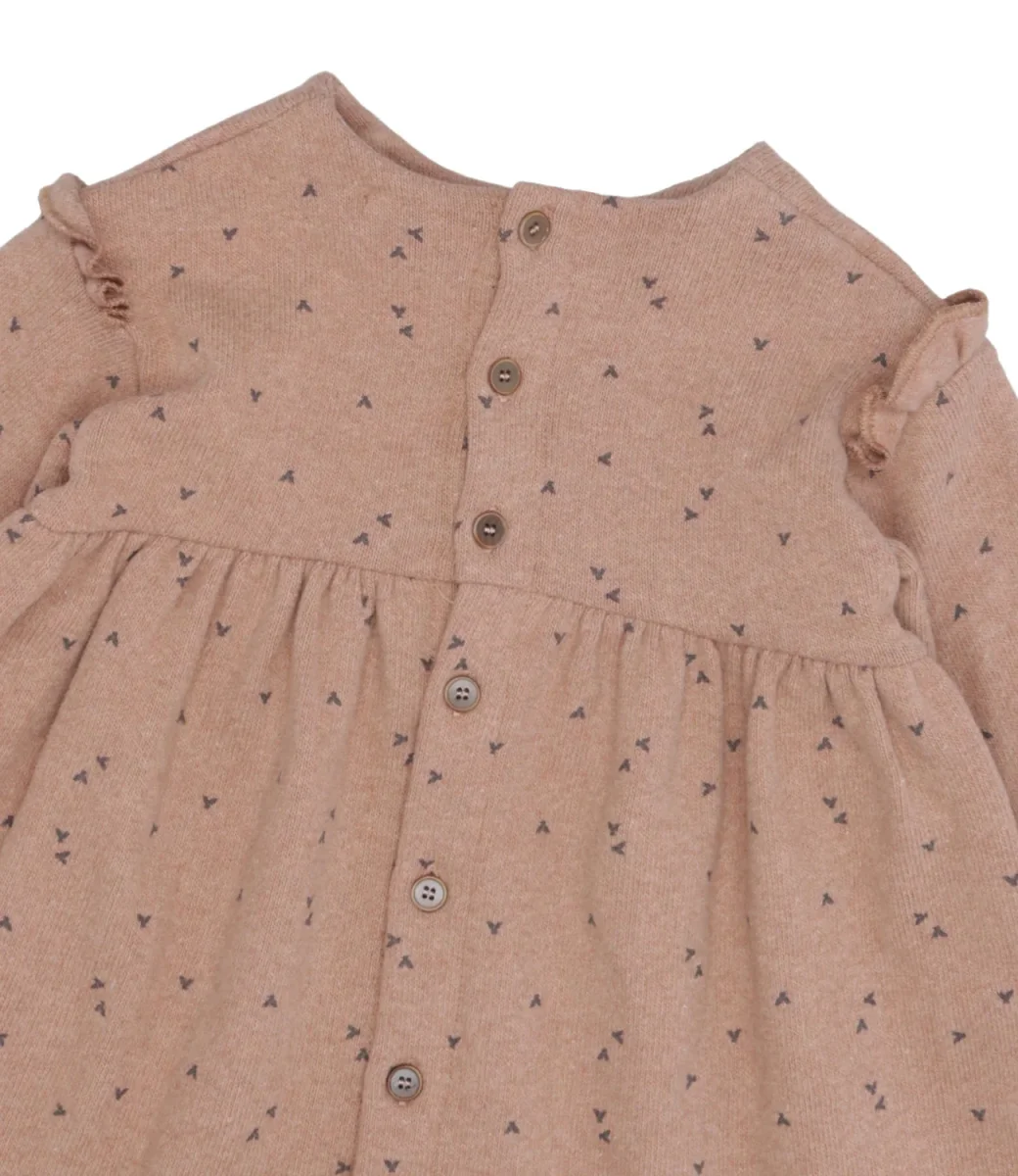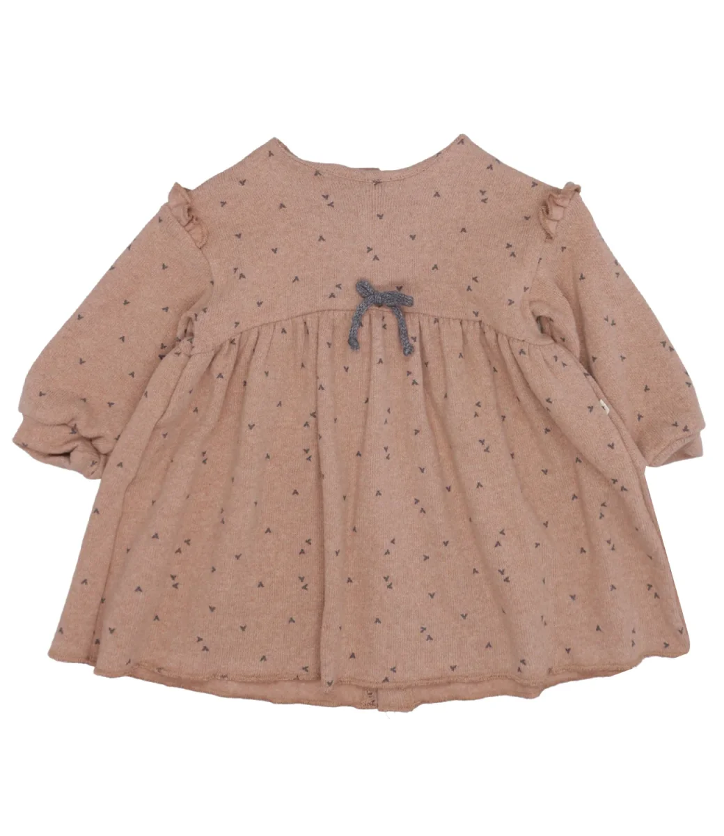 Abito 1+ in the family realizzato in misto cotone con fantasia con cuori, girocollo, maniche lunghe con polsini, voilant sulle spalle, cucitura in vita con fiocco applicato sul davanti, chiusura con bottoni sul retro, modello svasato, fondo dritto. Ecosostenibile.