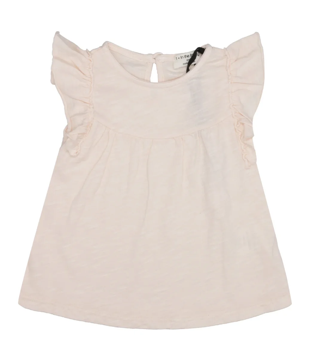 Blusa 1+ in the family in tessuto di cotone, girocollo, maniche annunciate con rouches applicate sulle spalle. Chiusura sul retro a goccia con bottoncino.