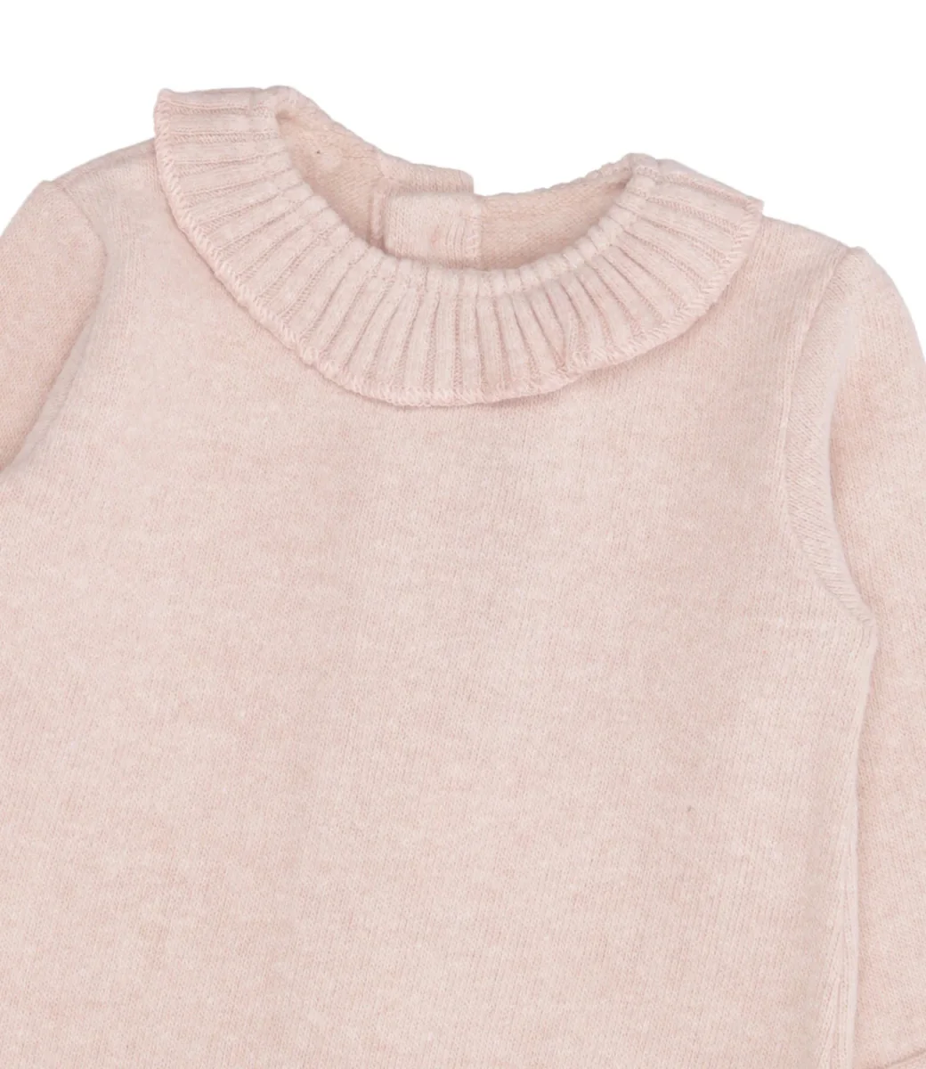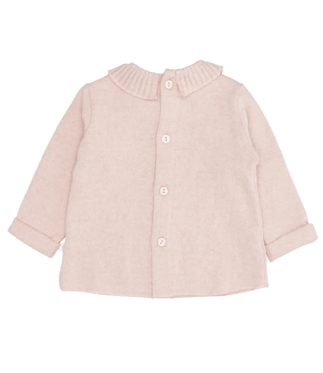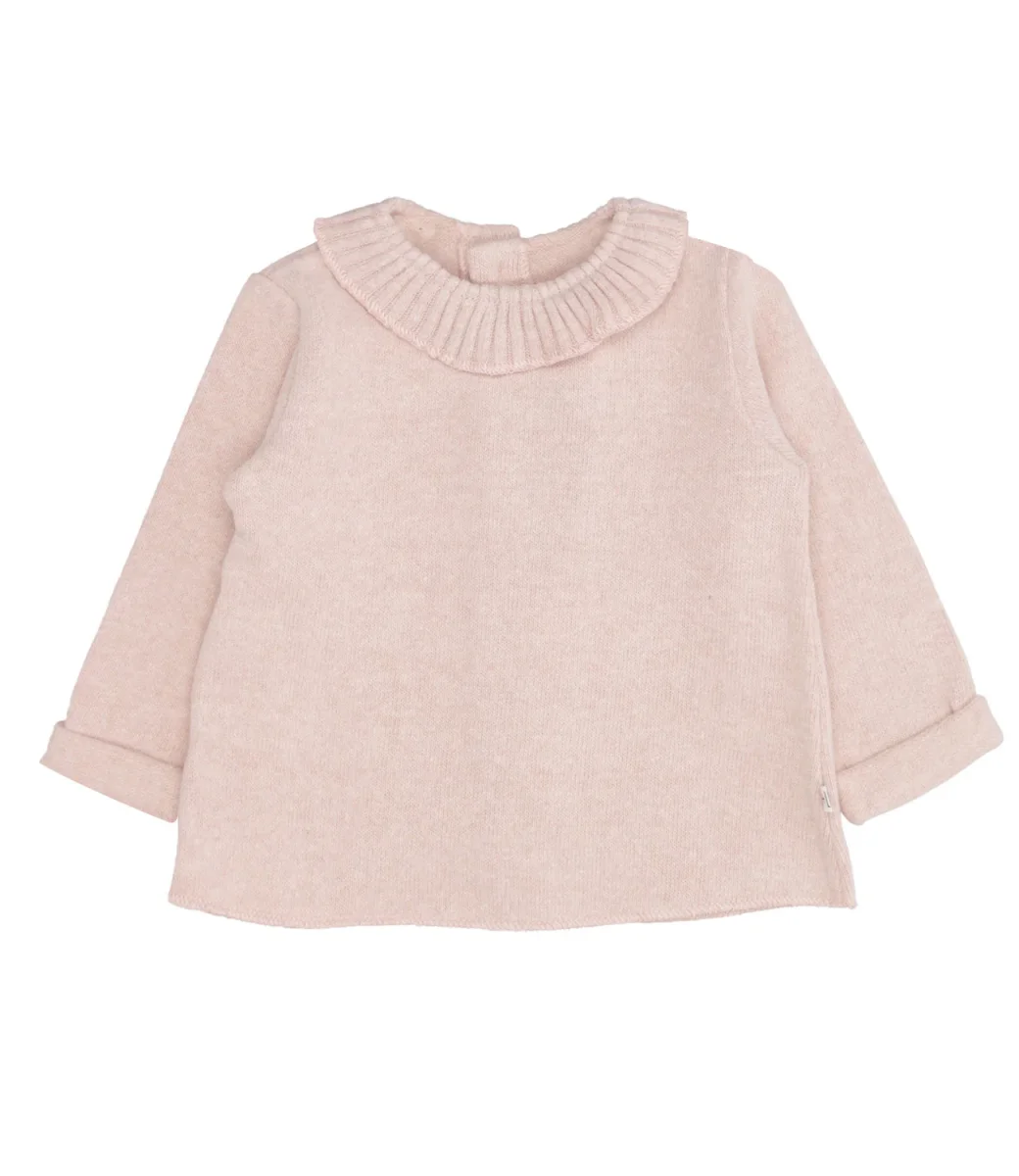 Maglia 1+ in the family in misto cotone, girocollo con voilant sul bordo a coste inglesi, maniche lunghe con polsino con risvolto, chiusura con bottoni sul retro, fondo dritto.