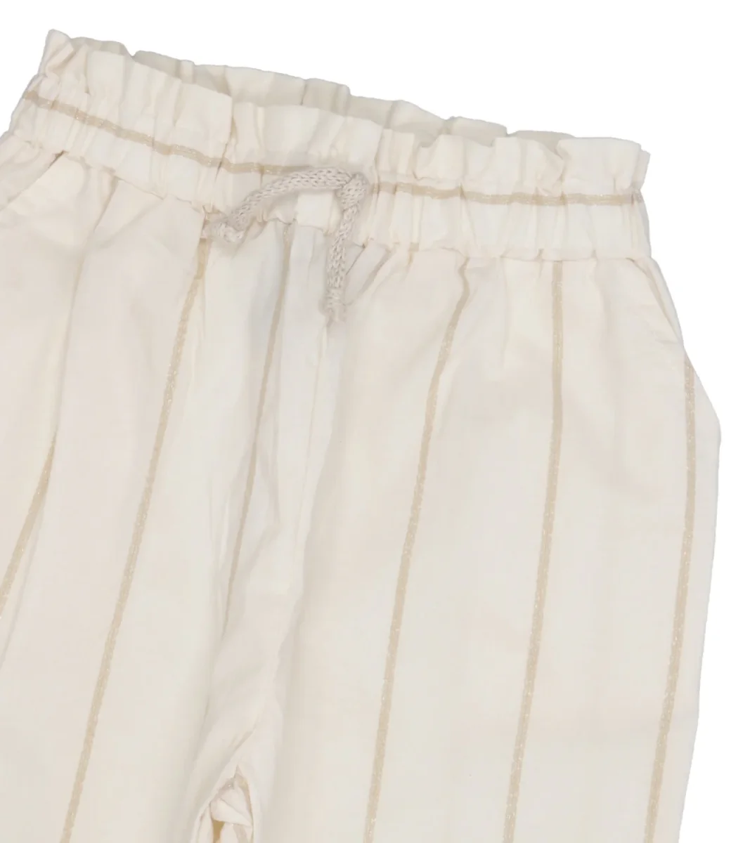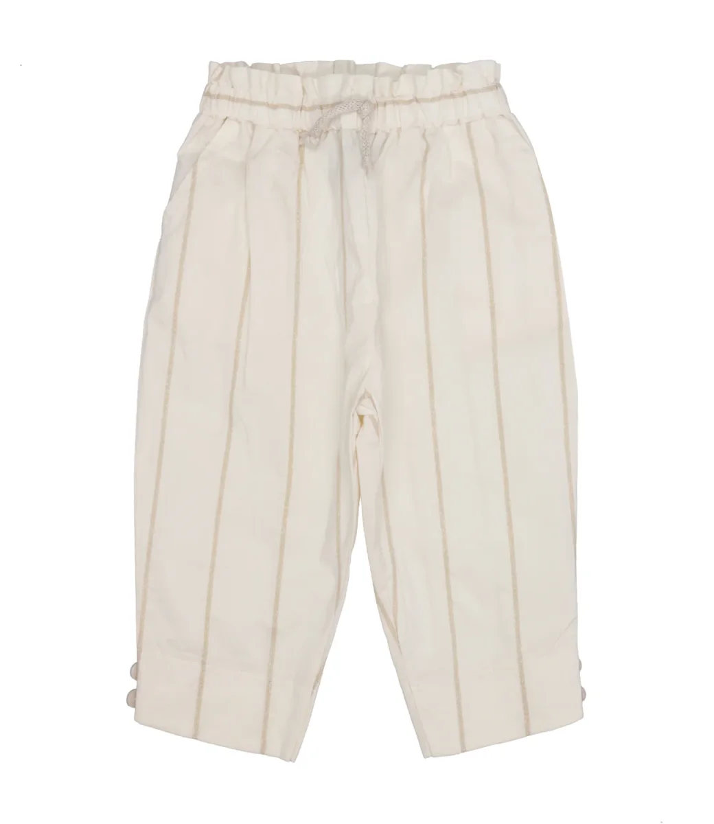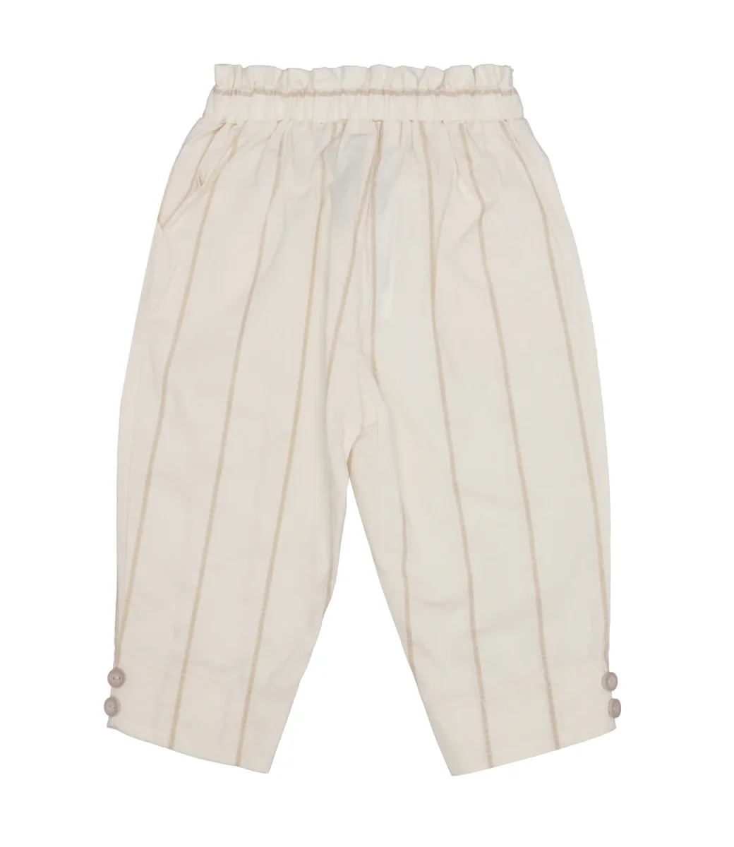Pantalone 1+ in the Family in cotone con vita arricciata e coulisse, tasche laterali e dettagli con bottoncini in legno applicati sul fondo.