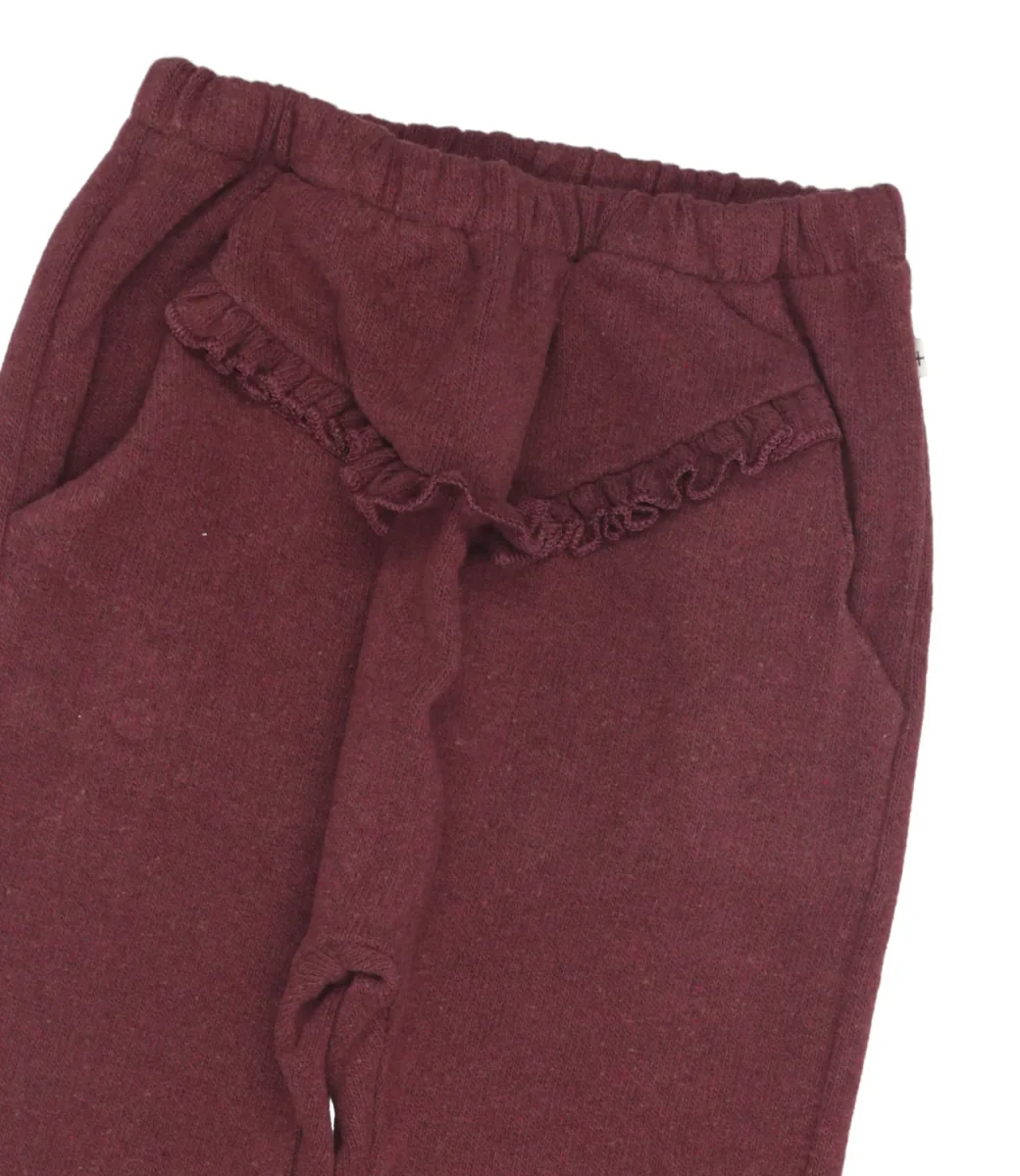 Pantalone 1+ in the family Romano in tessuto di misto caldo cotone con motivo a costine, decoro con rouches applicata con posizione a V sul davanti al bacino. Vita elasticizzata, tasche sui fianchi , fondo con con risvolto.