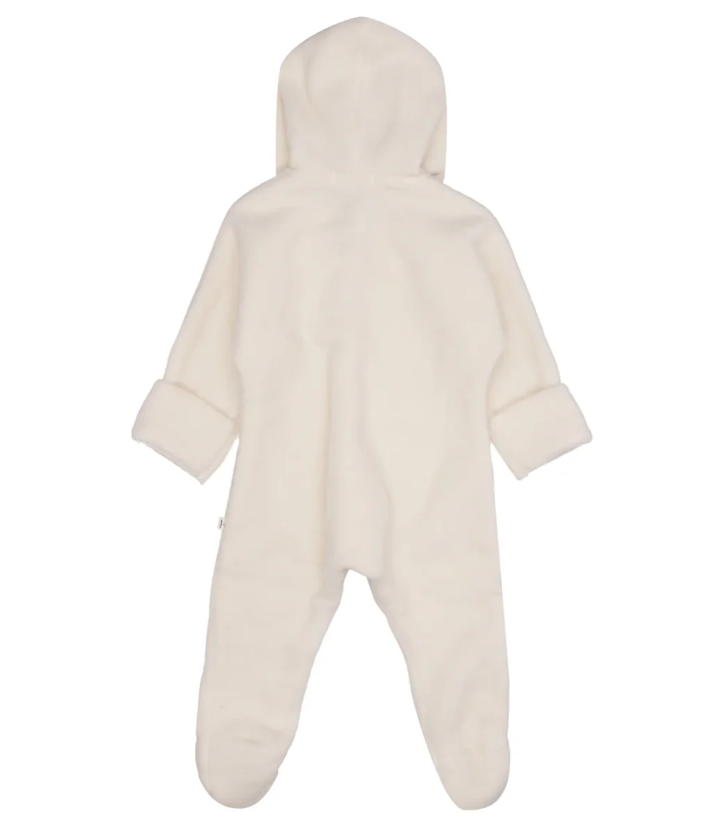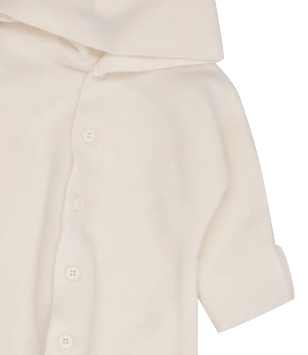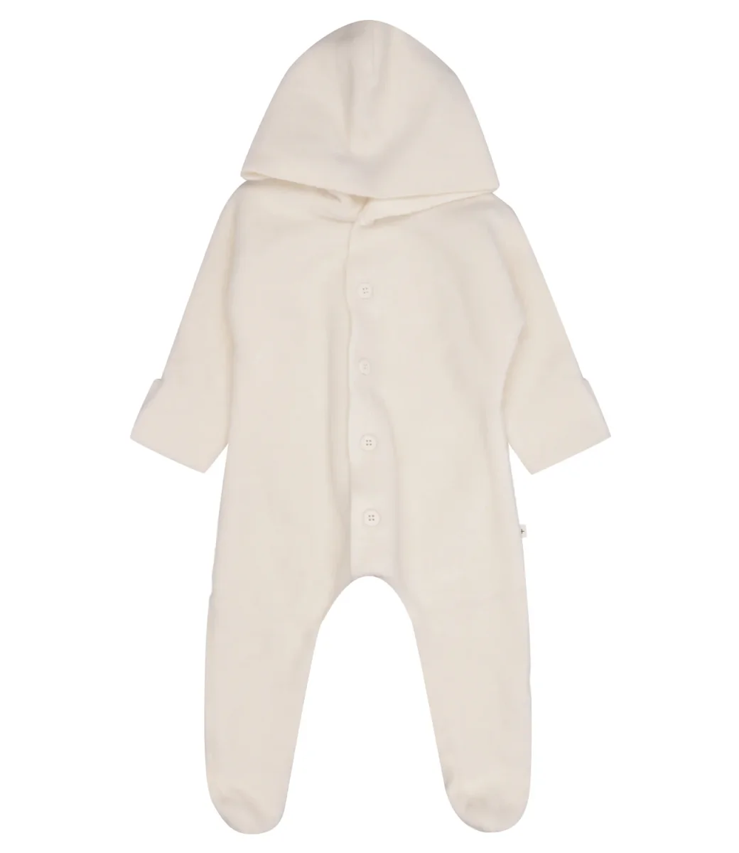 Tutina 1+ in the family Baptiste in caldo misto cotone. Modello con cappuccio, chiusura frontale con bottoni, maniche lunghe e copripiede al fondo.
