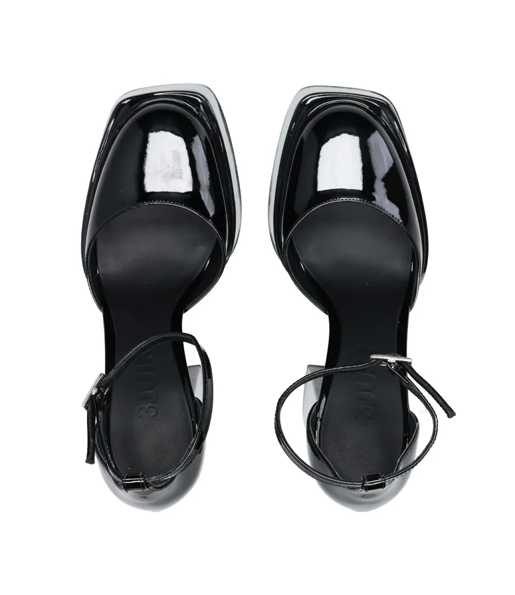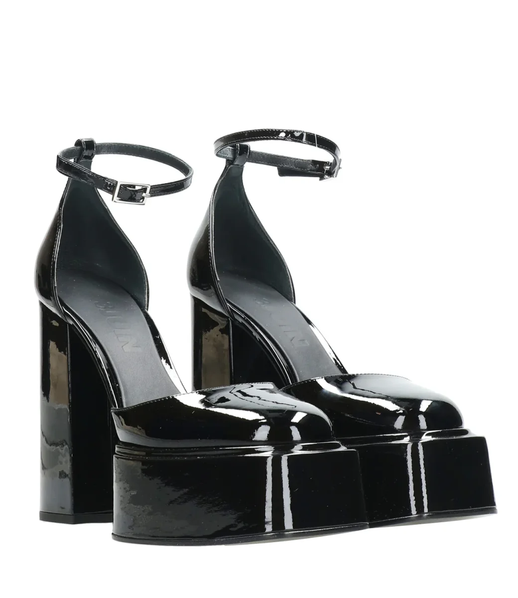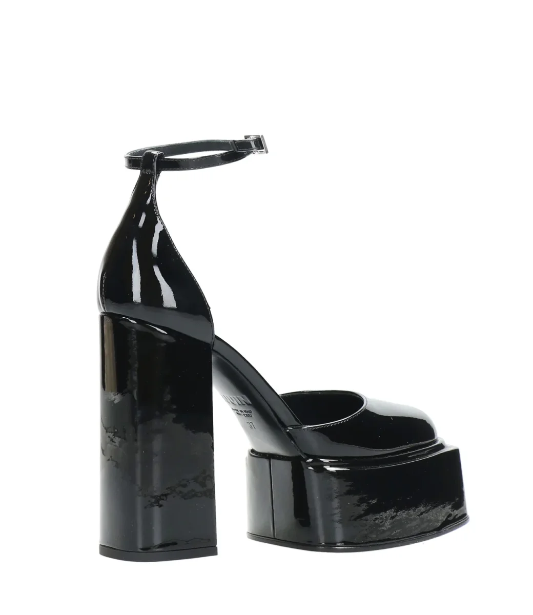 Décolleté da 115 mm in pelle di vitello nera lucida con plateau, punta tonda, cinturino alla caviglia con fibbia, tacco alto e largo e suola in cuoio.