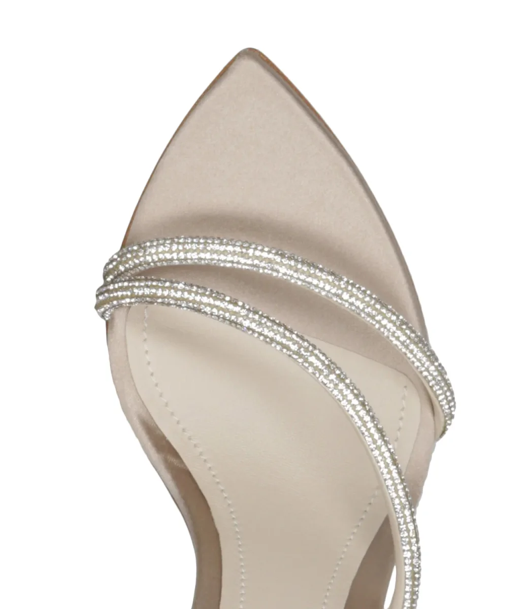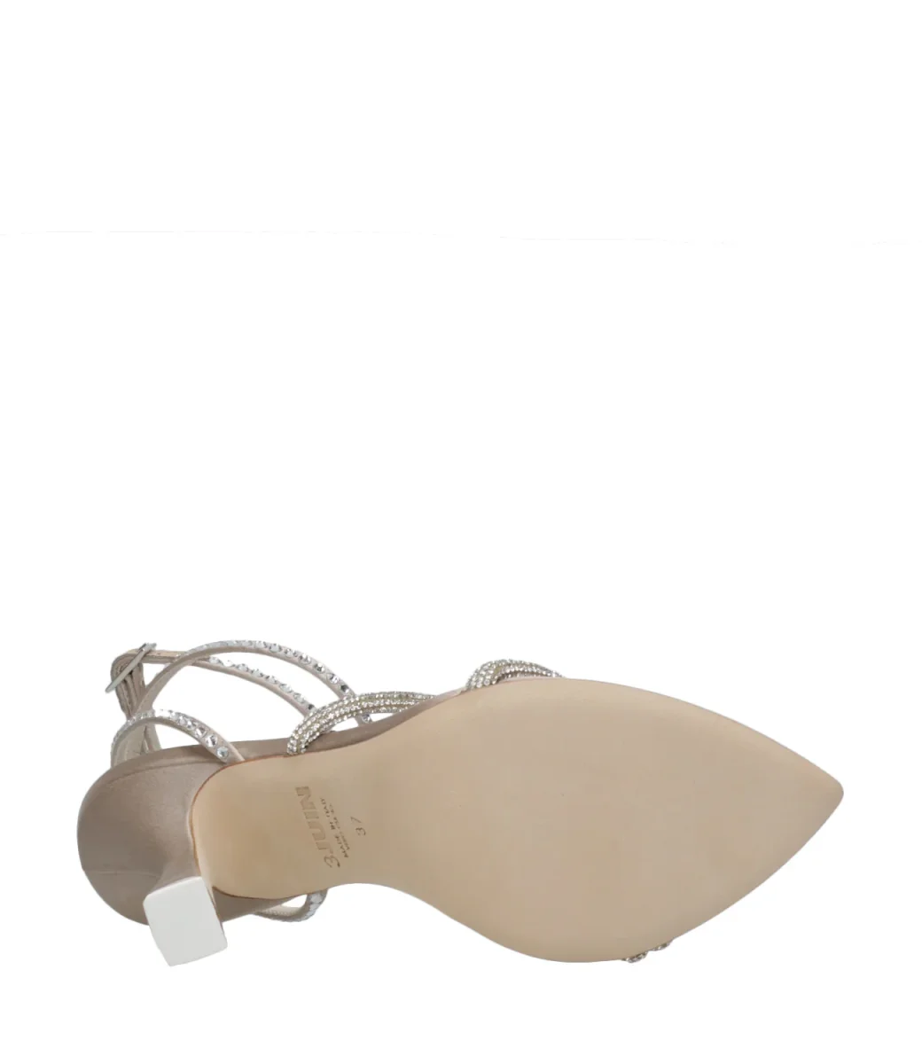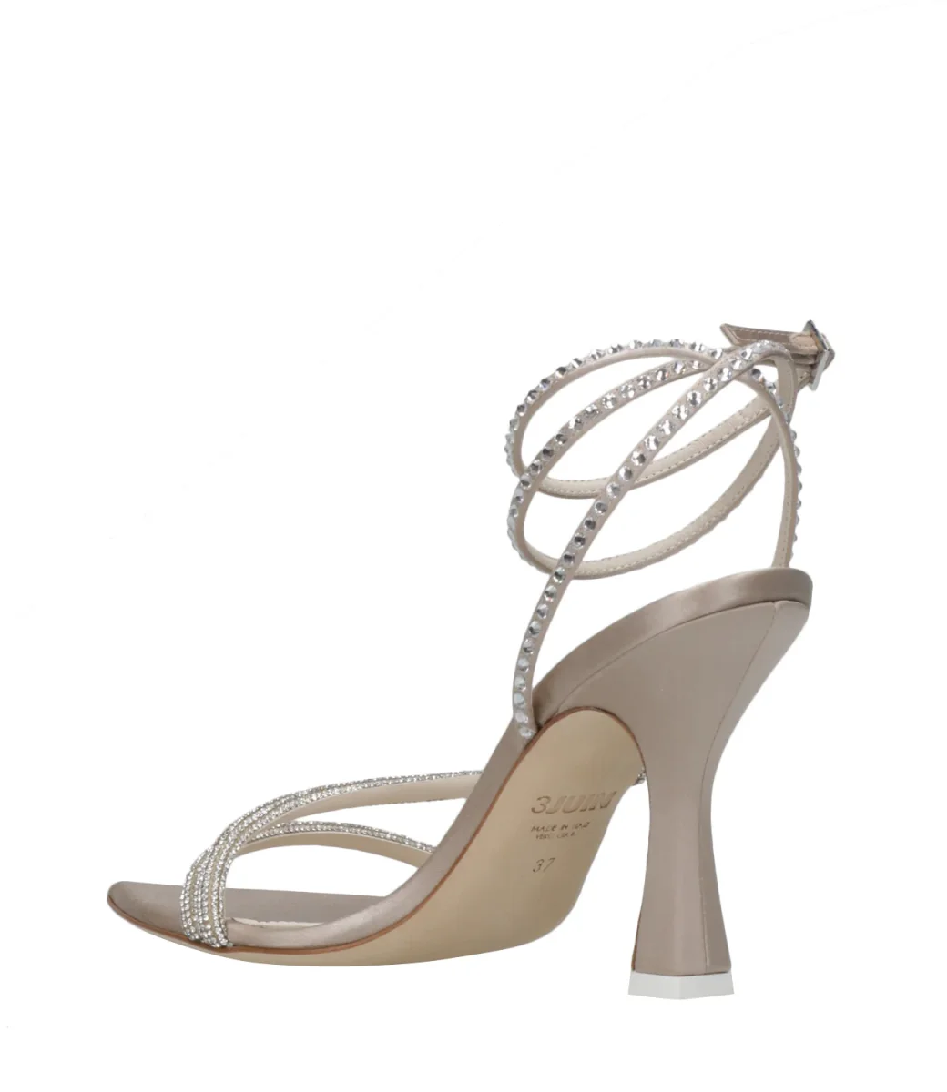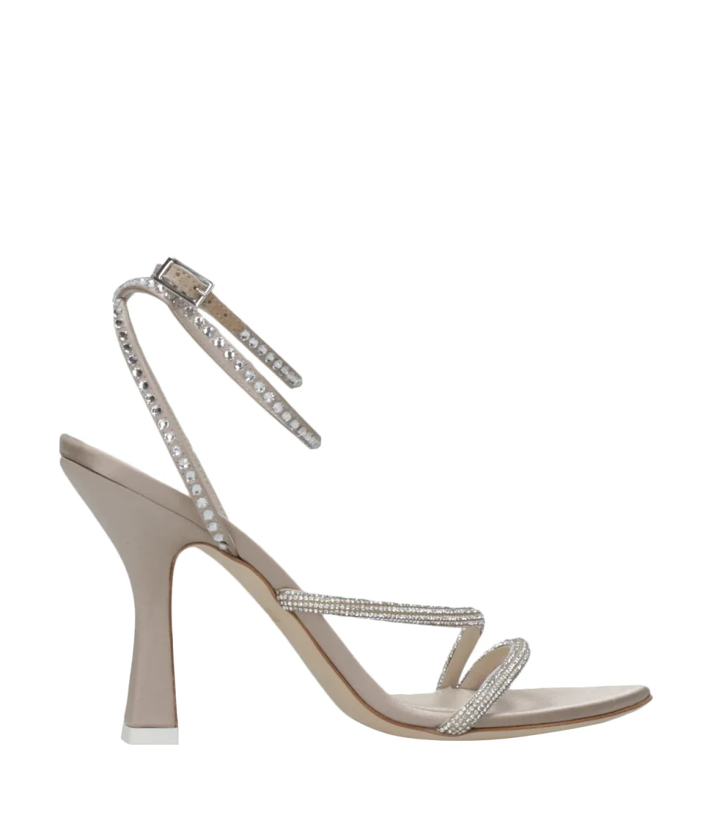 Sandali con decorazioni di cristalli e chiusura alla caviglia con fibbia.