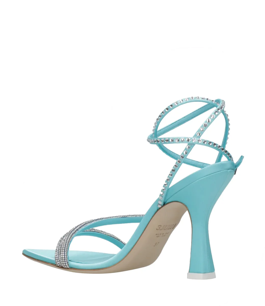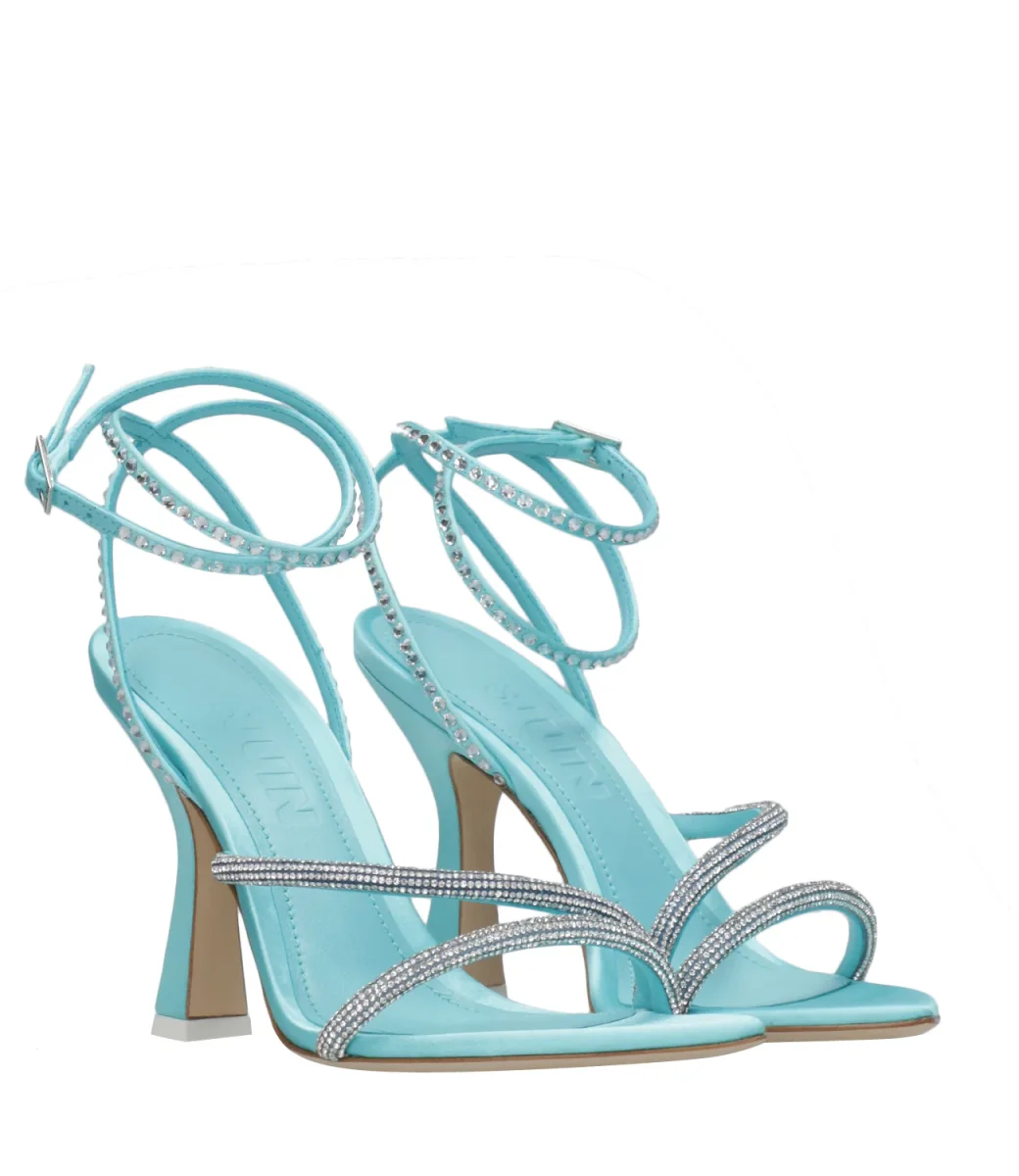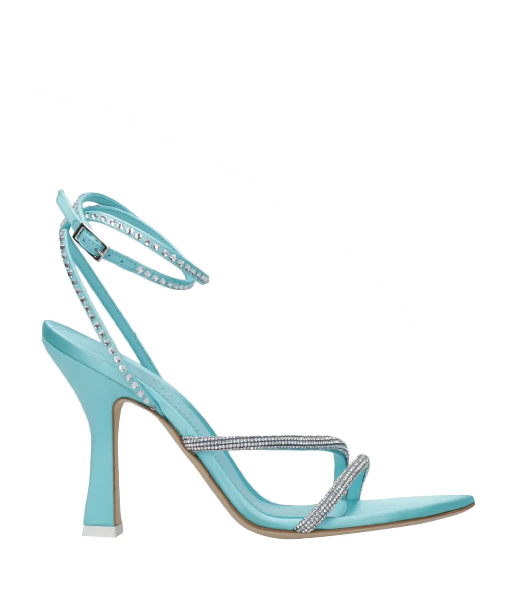 Sandali con decorazioni di cristalli e chiusura alla caviglia con fibbia.