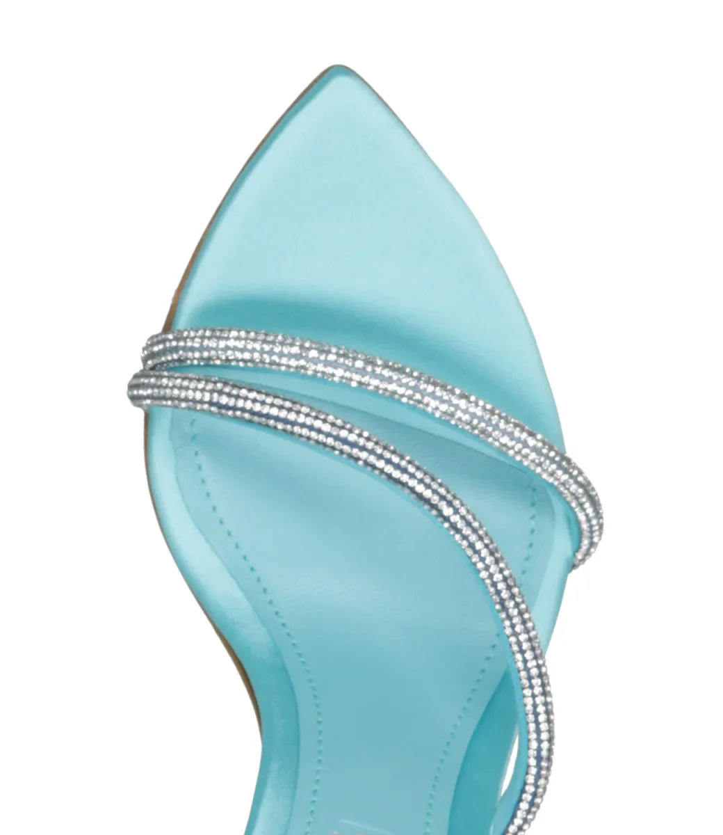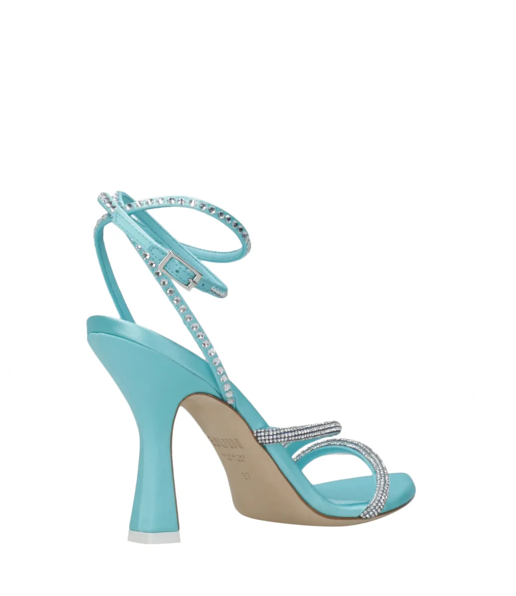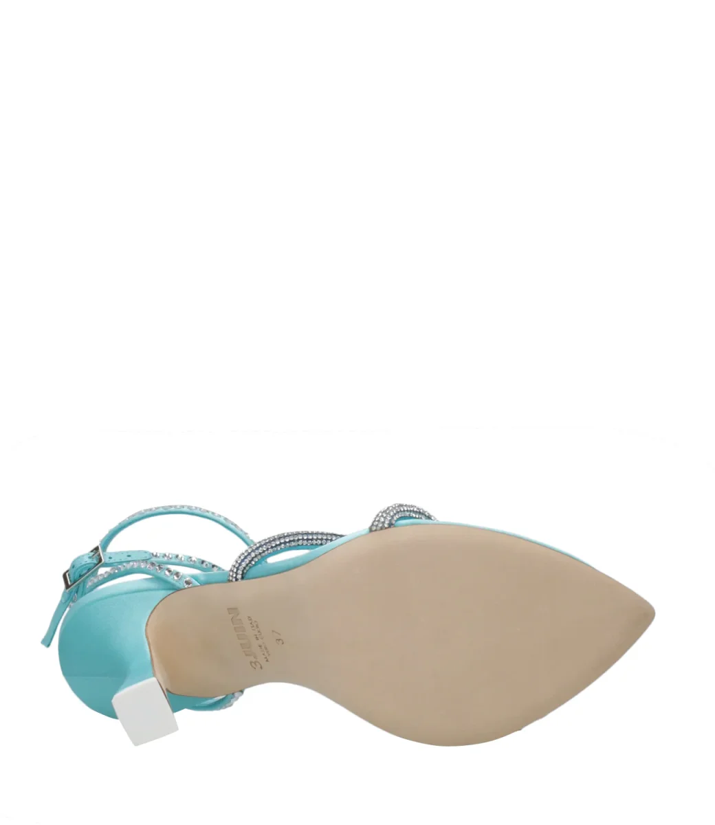 Sandali con decorazioni di cristalli e chiusura alla caviglia con fibbia.