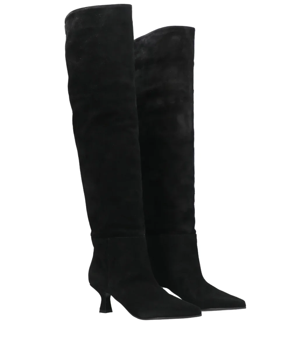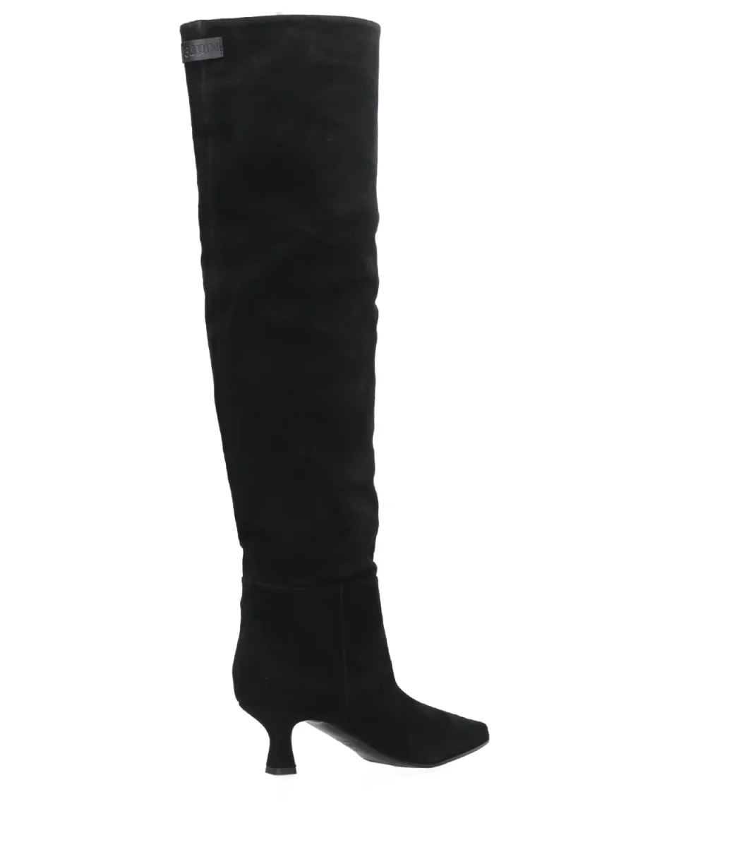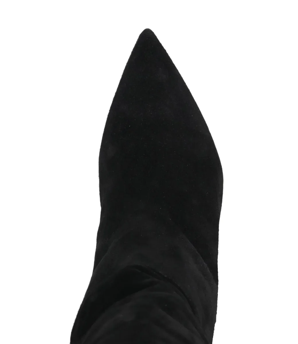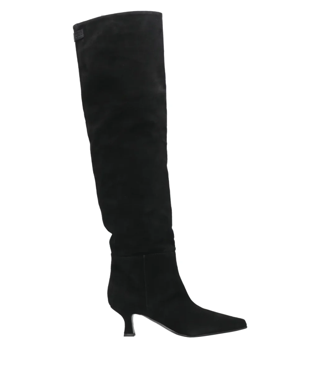 Stivale 3Juin realizzato in suede color nero con patch logo sul retro. Caratterizzato da punta affilata, fodere in pelle e suola in cuoio / gomma. Completa il design il tacco a rocchetto rivestito.