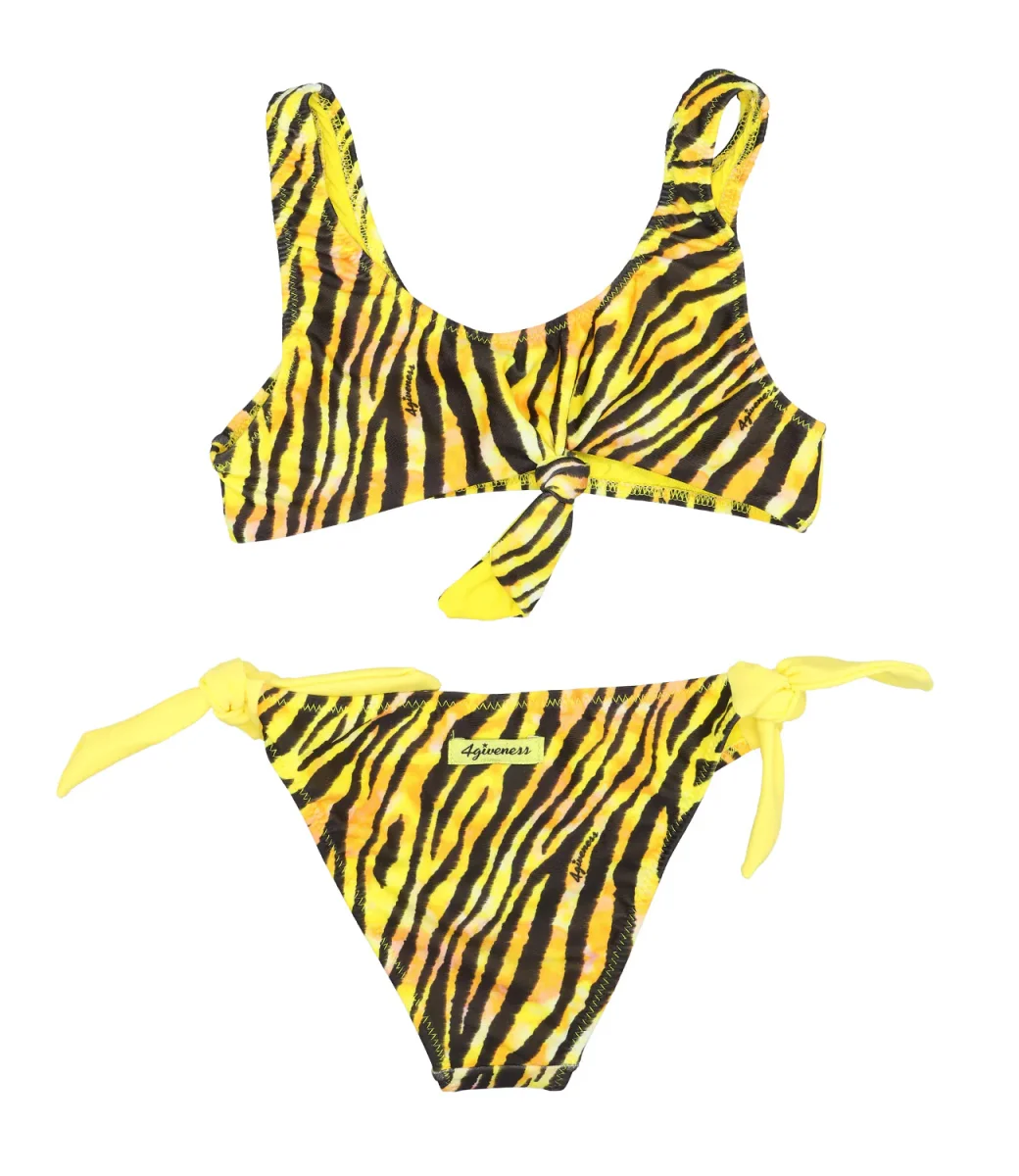Costume bikini 4giveness Batik Twist Zebra giallo e nero, top con nodo sul retro, slip con lacci laterali, logo sul retro