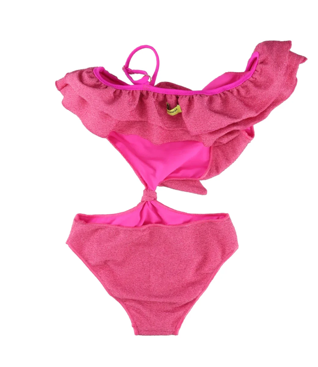 Costume Trikini 4giveness Kids in tessuto lurex stretch fuxia, modello monokini taglio slip, con volant a bordo scollo e su una spalla e una spallina stretta regolabile in lunghezza sulla spalla opposta, nodo di giunzione a centro ventre e etichetta logo in tessuto cucita sulla schiena