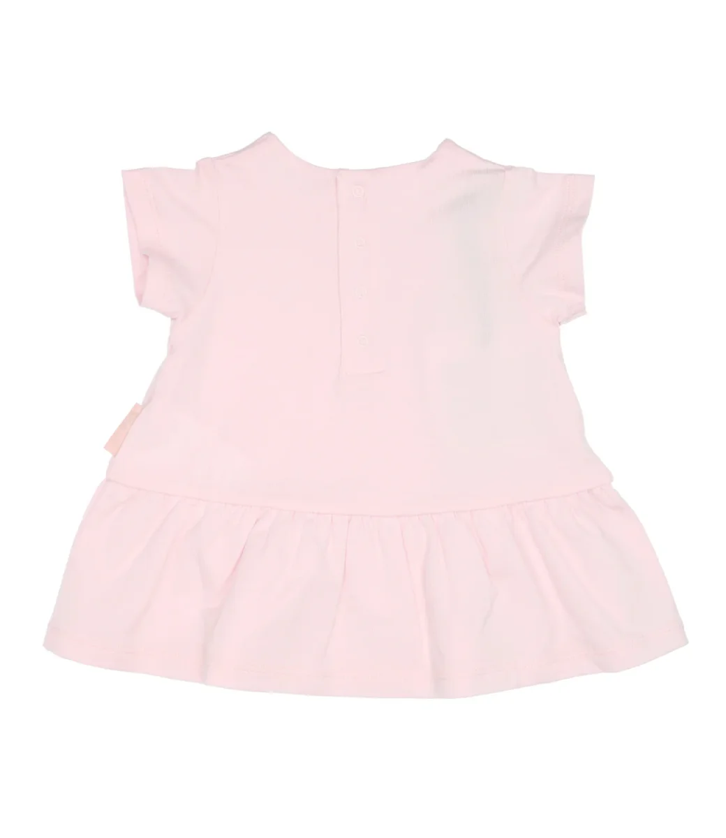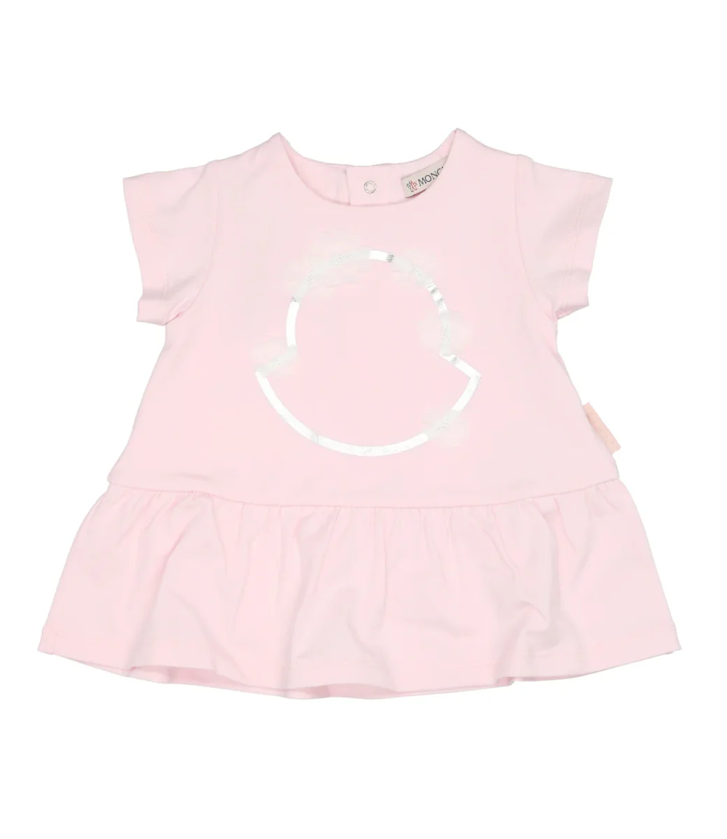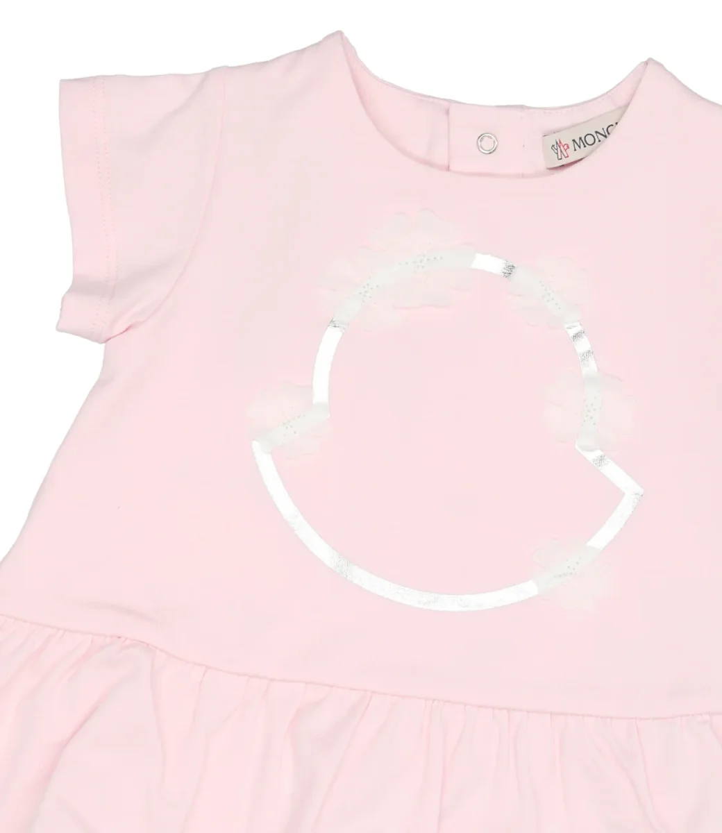 L’abito Moncler rosa ha una linea ad A con collo a giro, maniche corte e balza al fondo. Realizzato in jersey stretch, si caratterizza per il logo Moncler stampato in tonalità argento con fiori applicati. Facile da indossare grazie alla chiusura con bottoni a pressione sul retro.