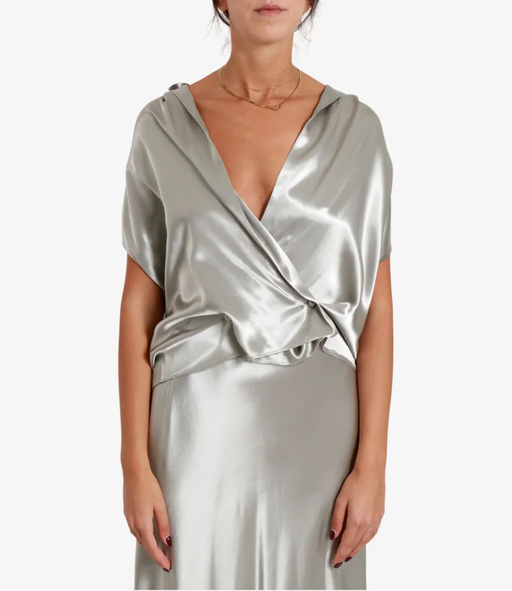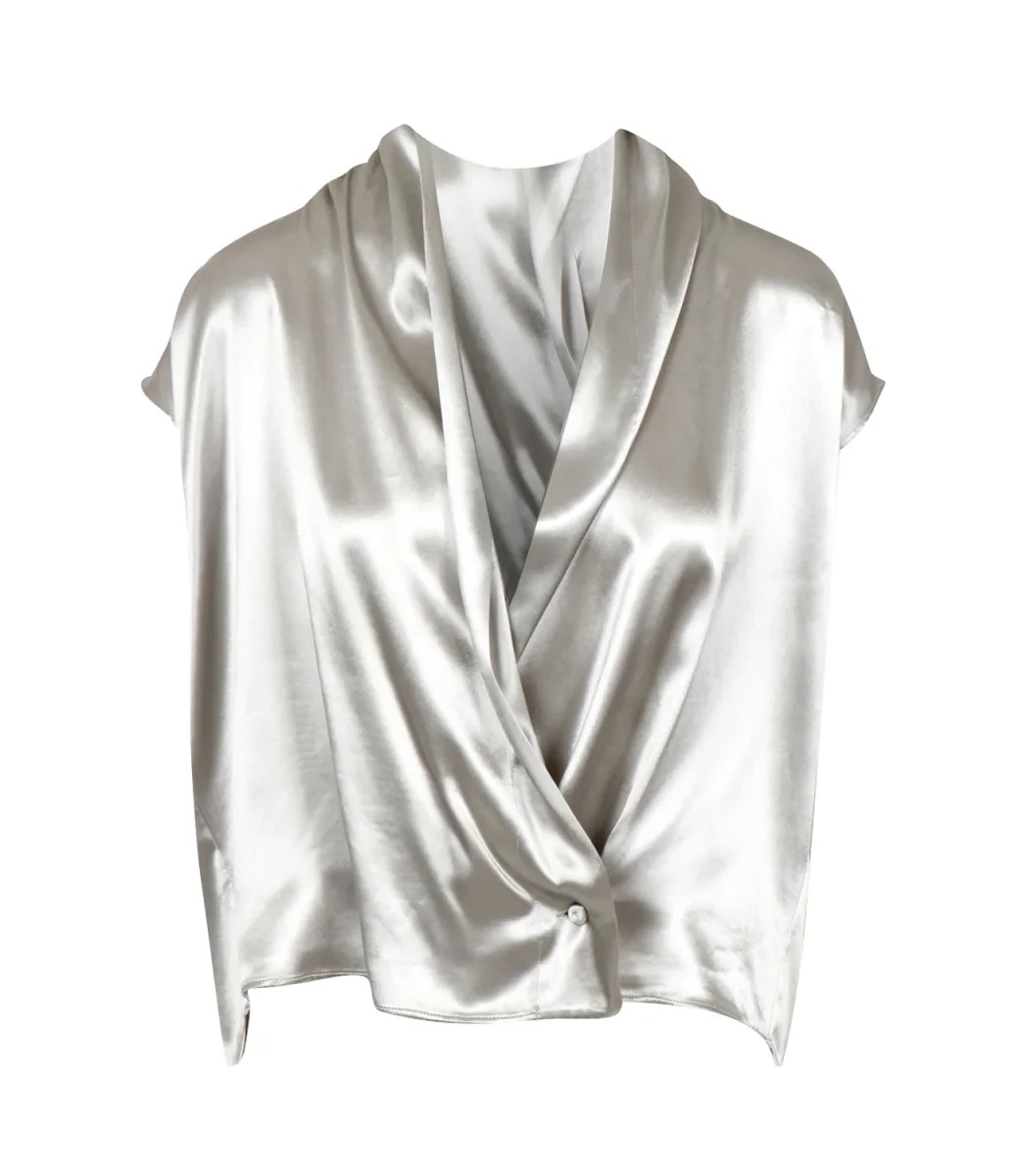 Camicia Alberta Ferretti realizzato in raso lucido, silhouette scivolata con scollo a V sul davanti creato con lembo sovrapposto creando un elegante drappeggio.