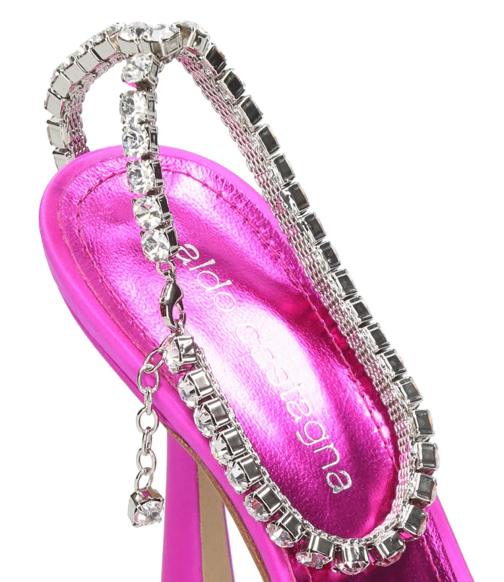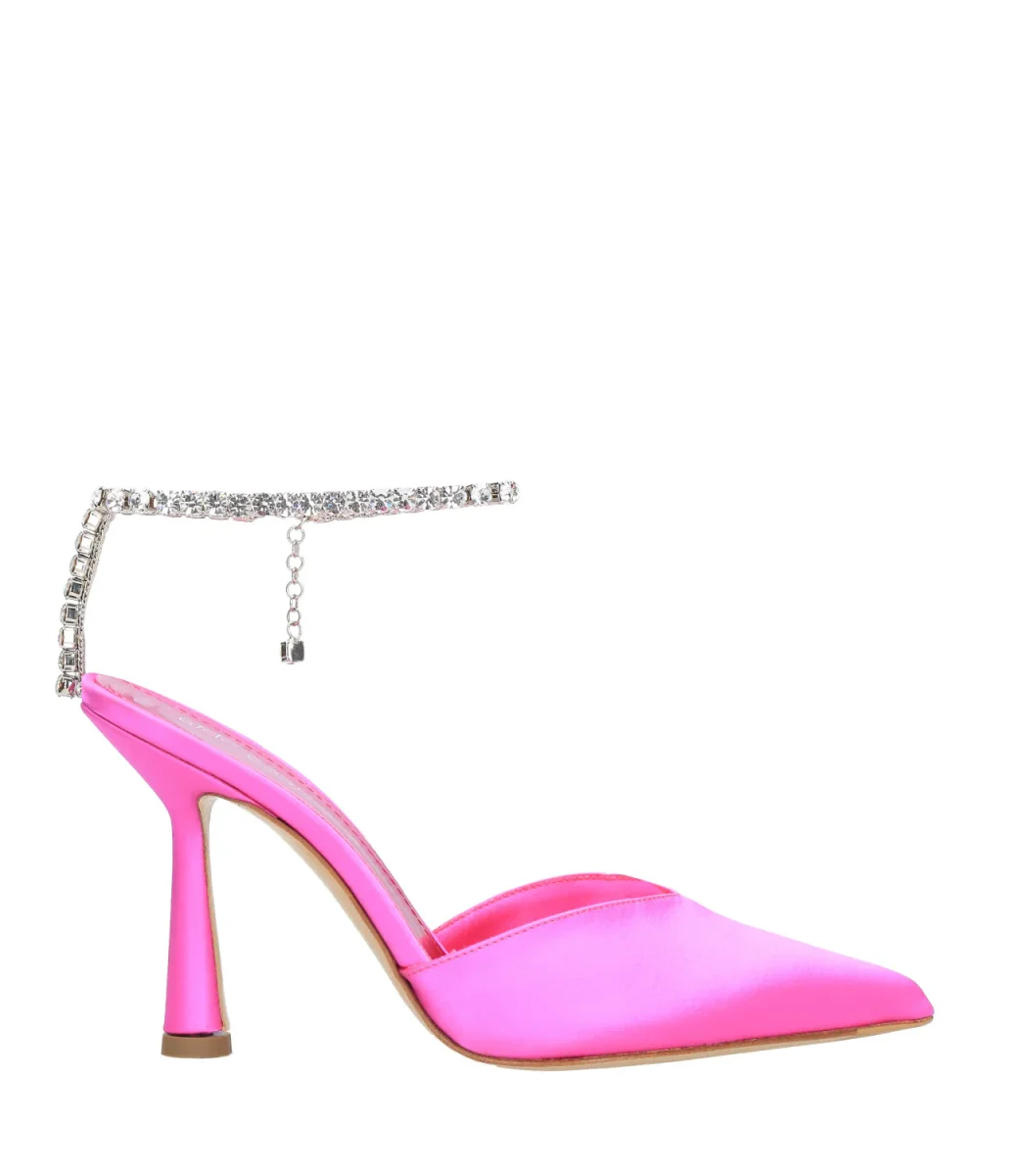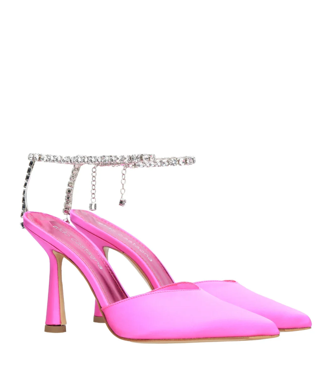 Decolleté Aldo Castagna Emily in raso fuxia con cinturino alla caviglia regolabile con elementi Swarovki, design a punta e tacco rivestito.