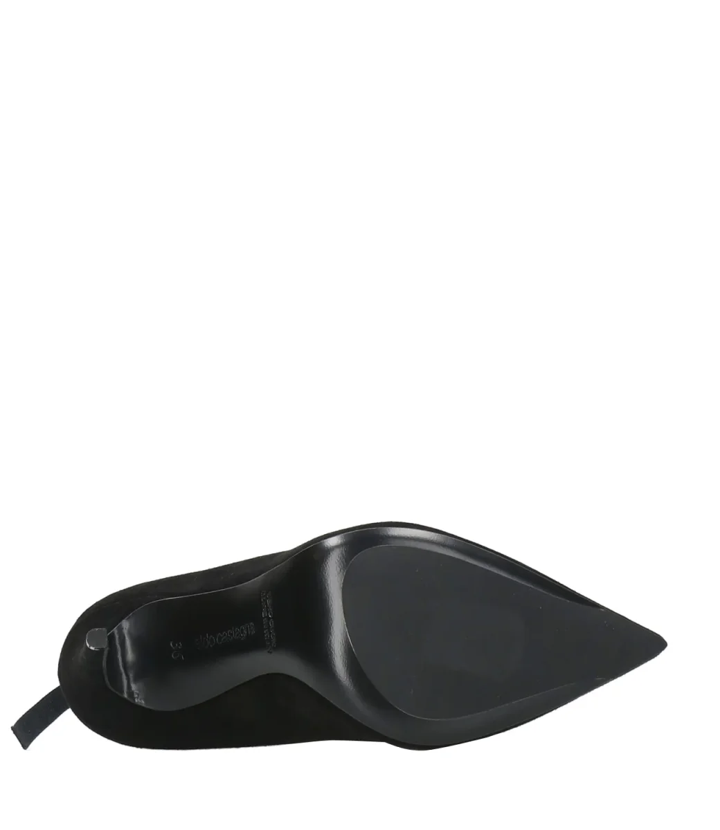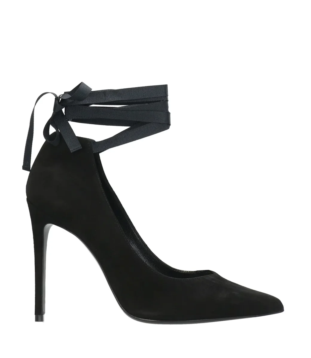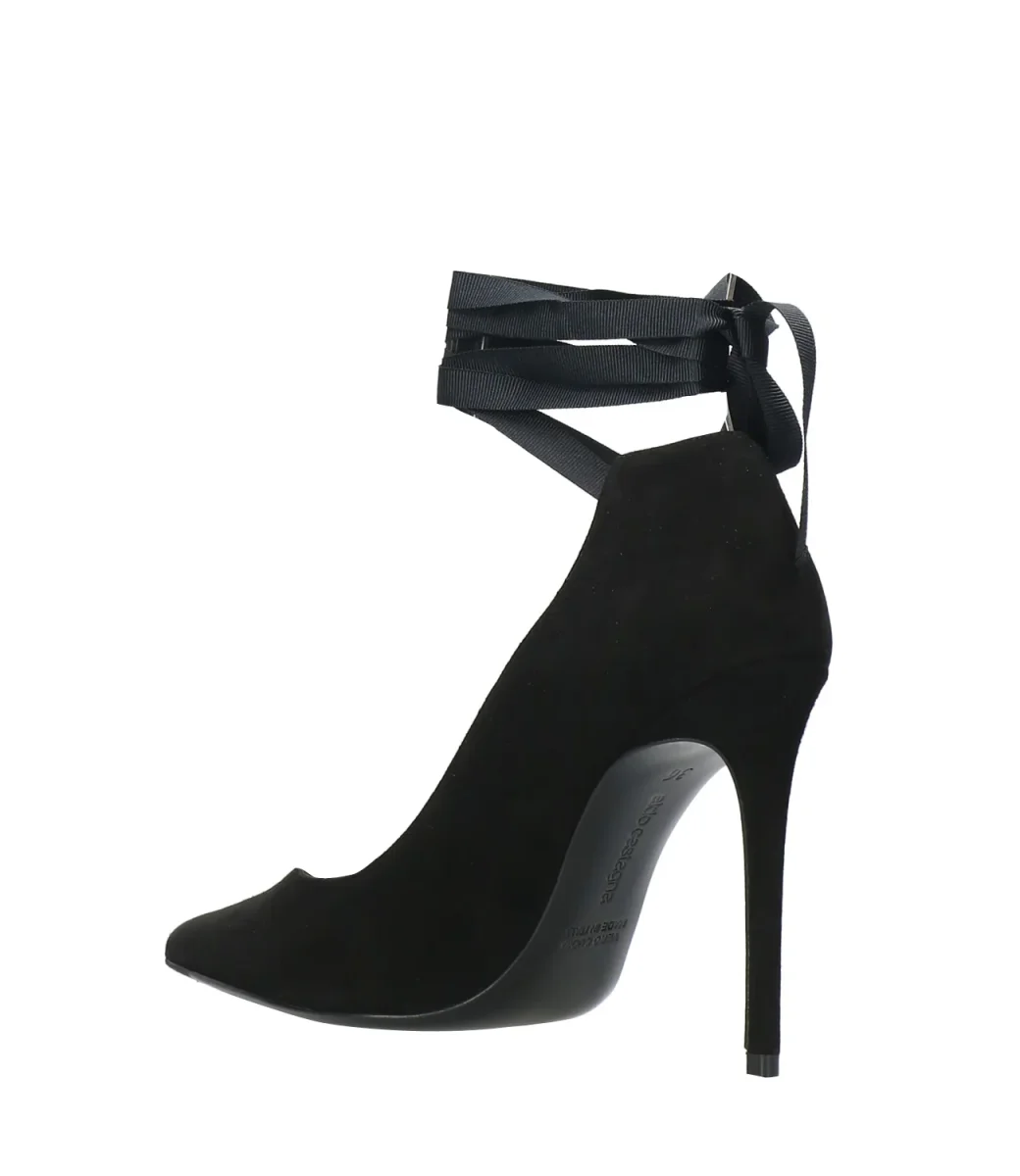 Decolletè Aldo Castagna in pelle scamosciata nera, con chiusura alla caviglia con laccio in tessuto da annodare, tacco a spillo rivestito