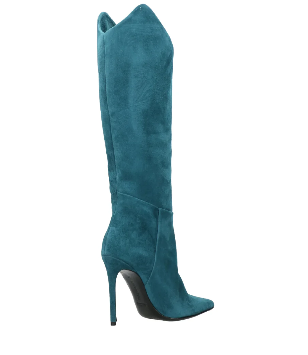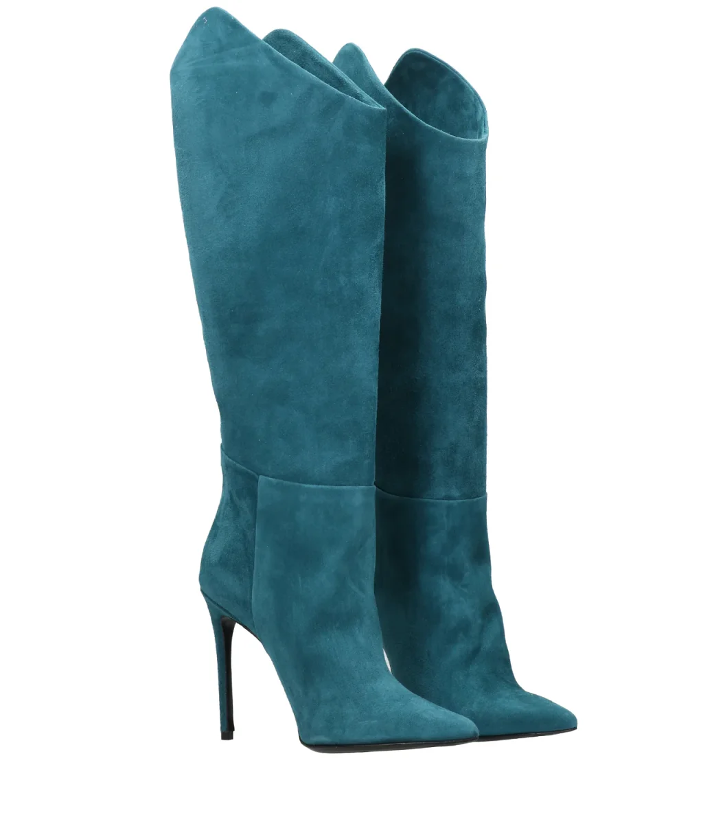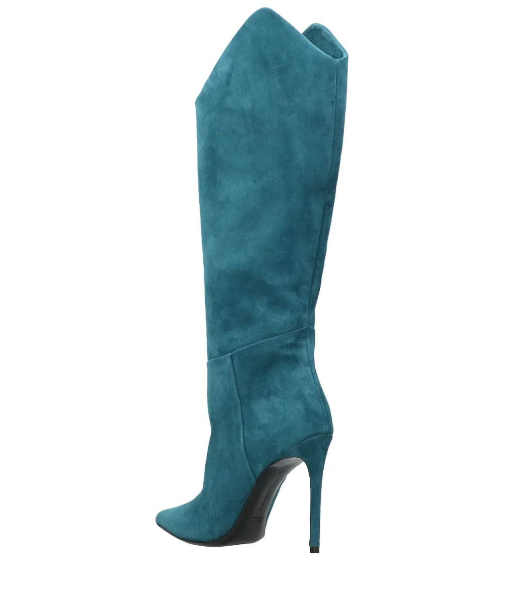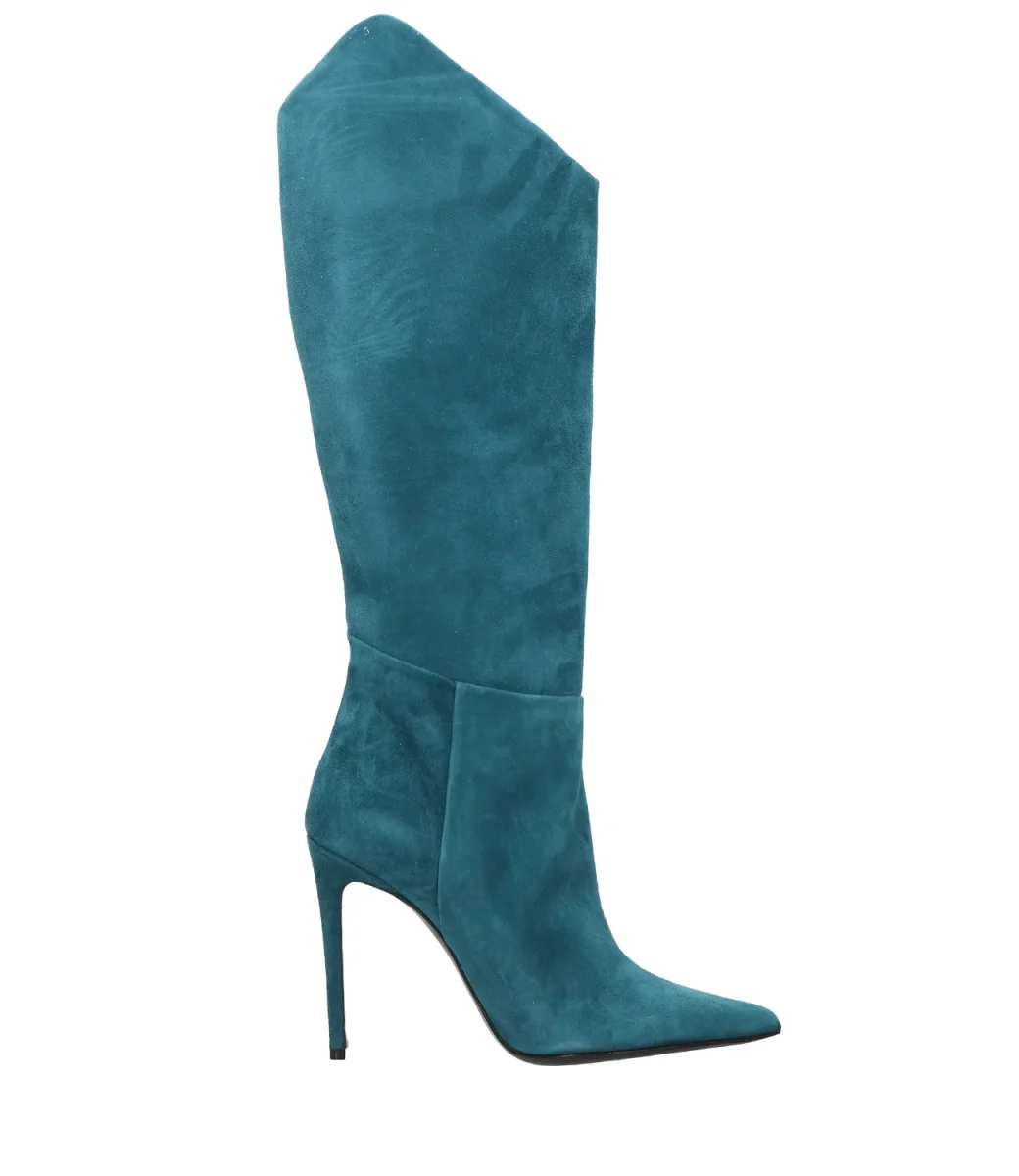 Stivale Aldo Castagna in pelle scamosciata petrolio, modello a punta, tacco a spillo rivestiro, gambale al ginocchio che termina a punta sui laterali, suola in cuoio.