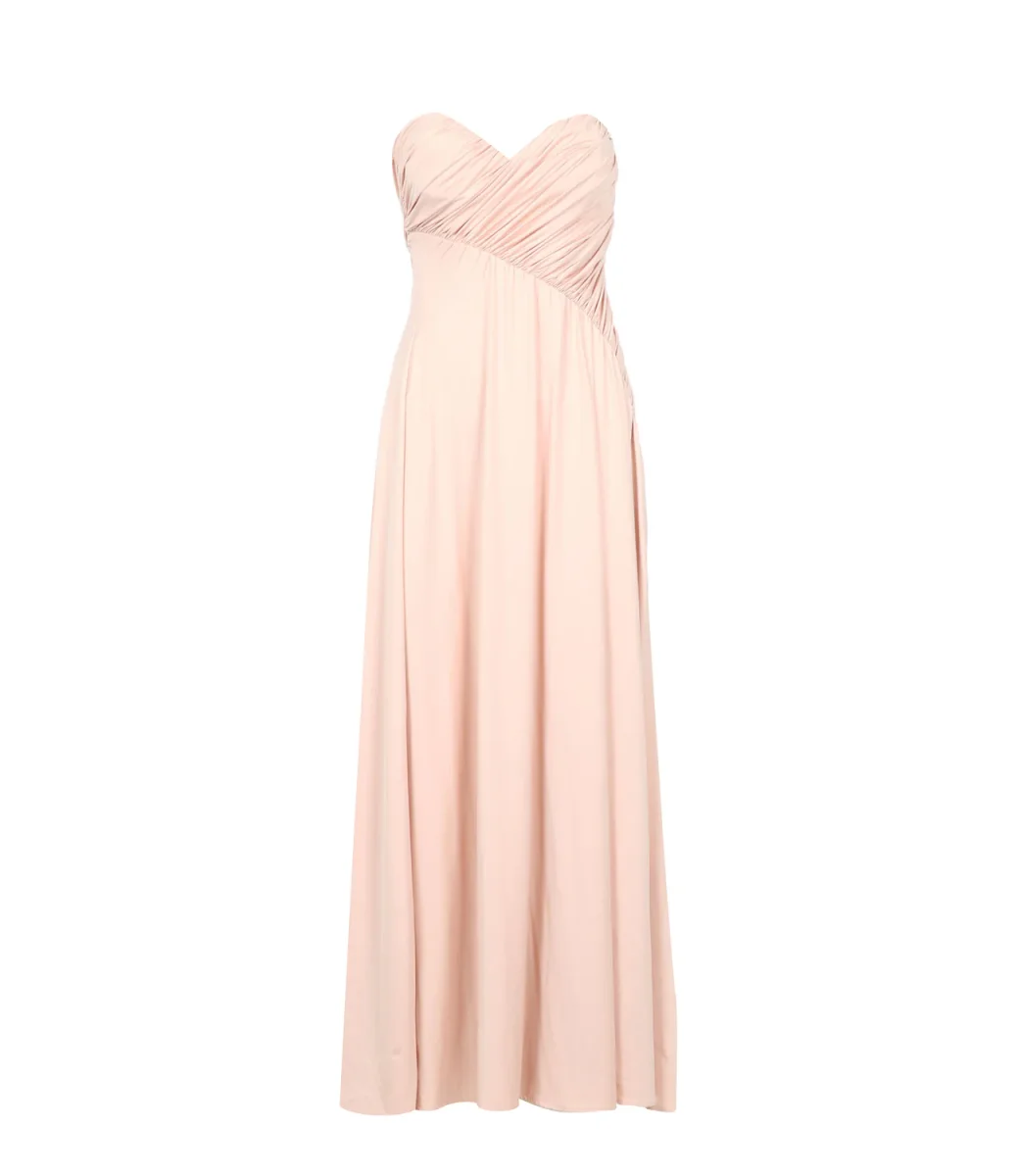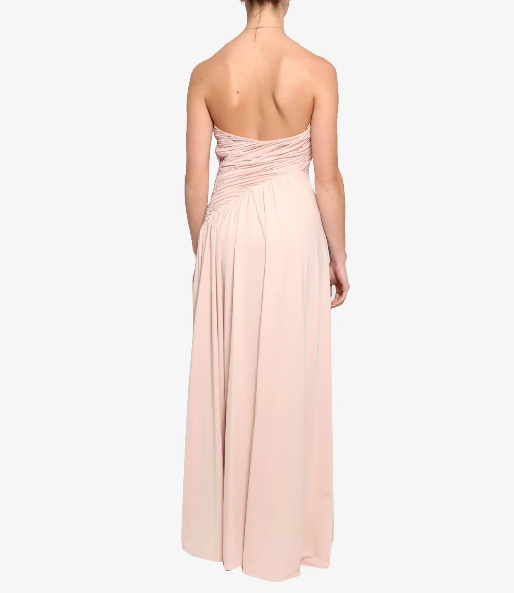 Abito lungo con corpetto aderente arricciato e spacco profondo davanti.