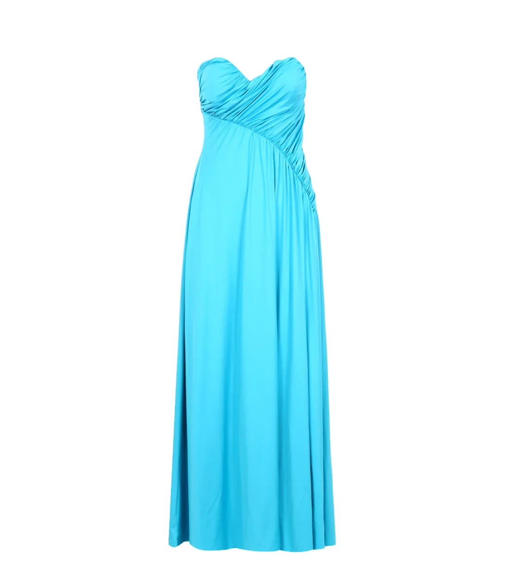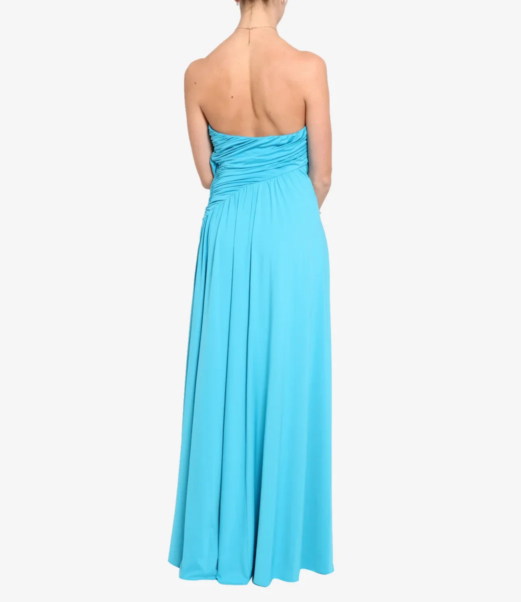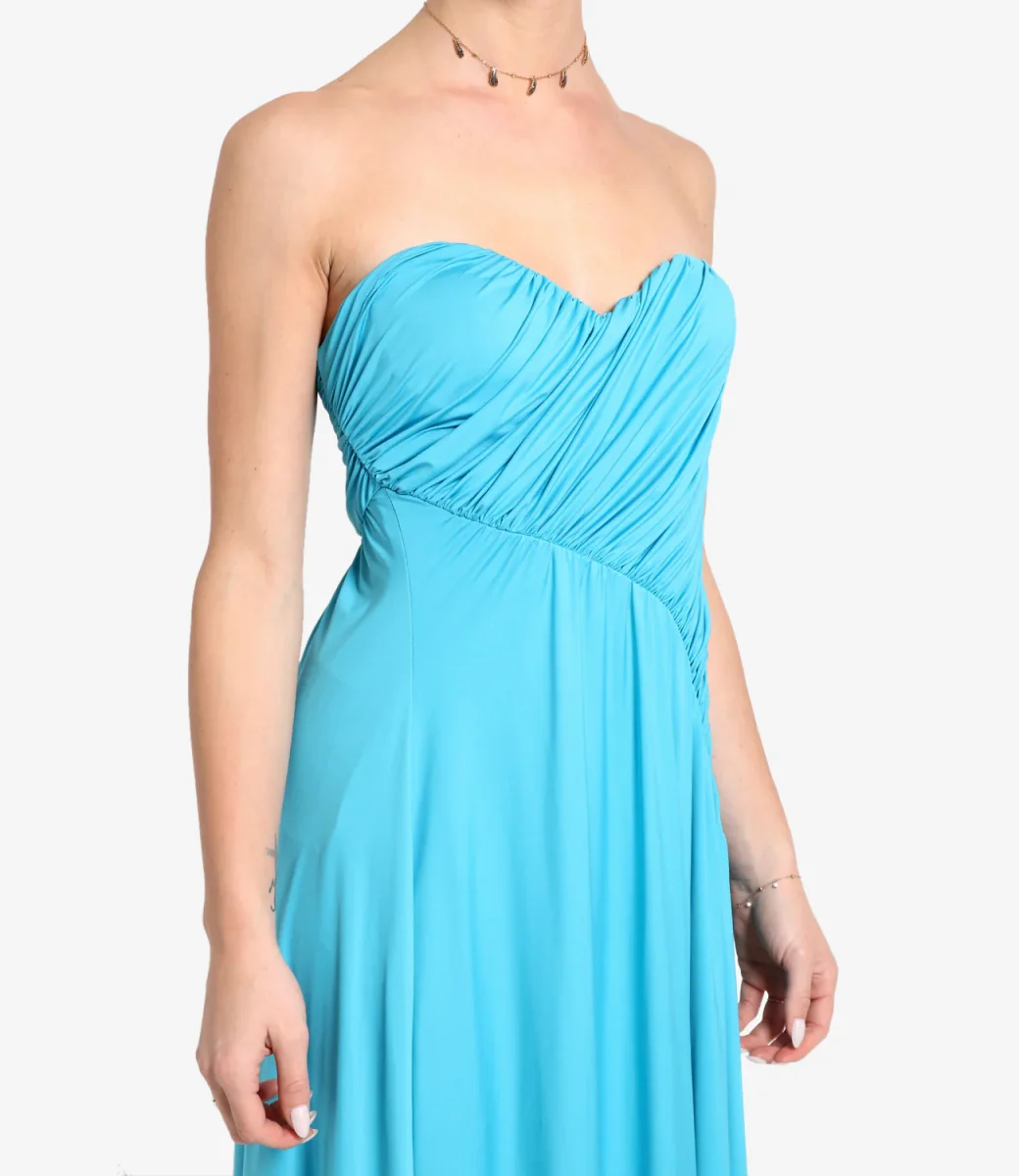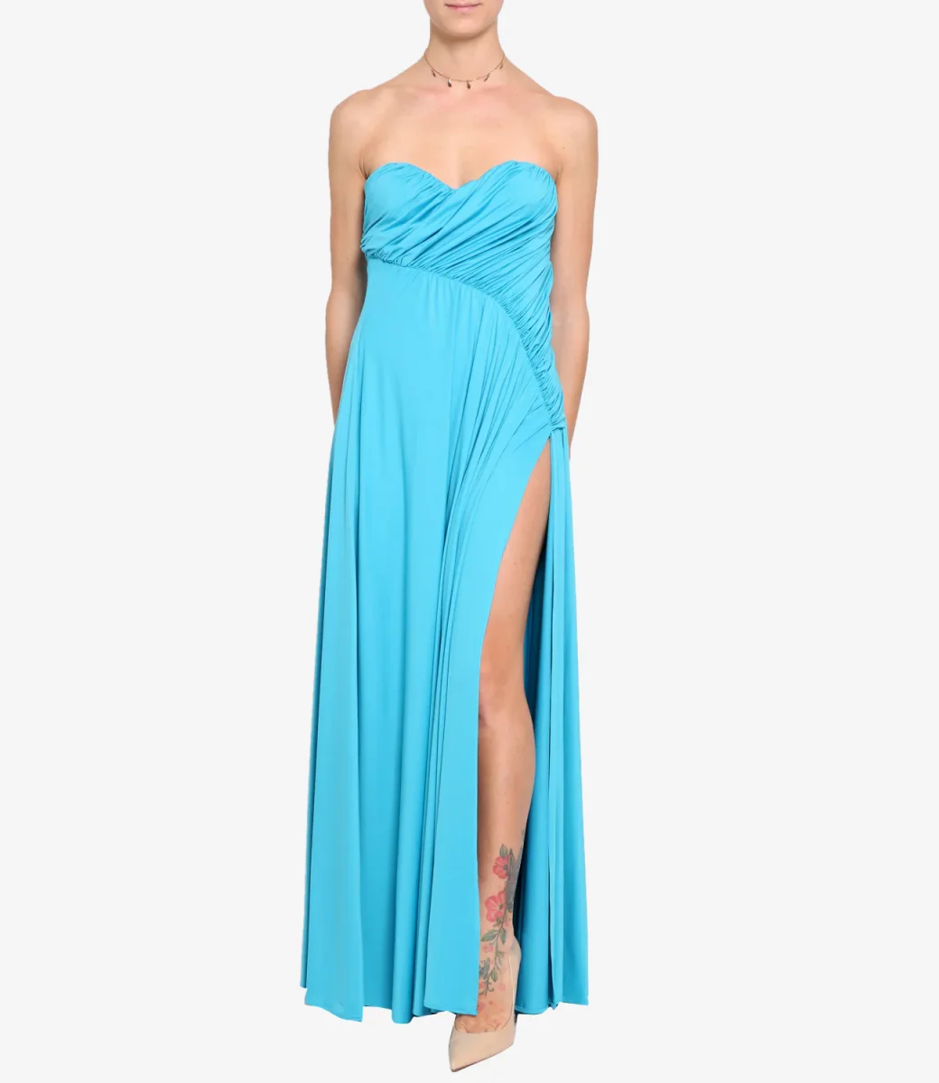 Abito lungo con corpetto aderente arricciato e spacco profondo davanti.