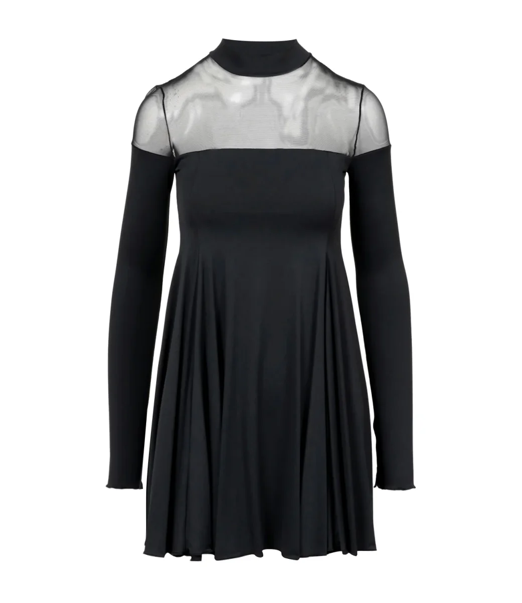 Abito Aniye By Jett Doll, modello mini con gonna a ruota in lycra. Modello a collo alto e maniche lunghe. La gonna a ruota aggiunge movimento al look, mentre le trasparenze sulle spalle donano un effetto seducente al capo.