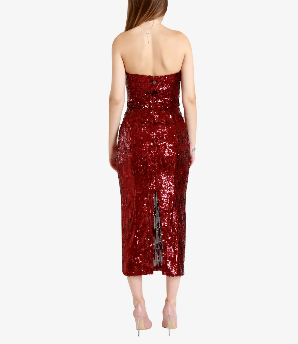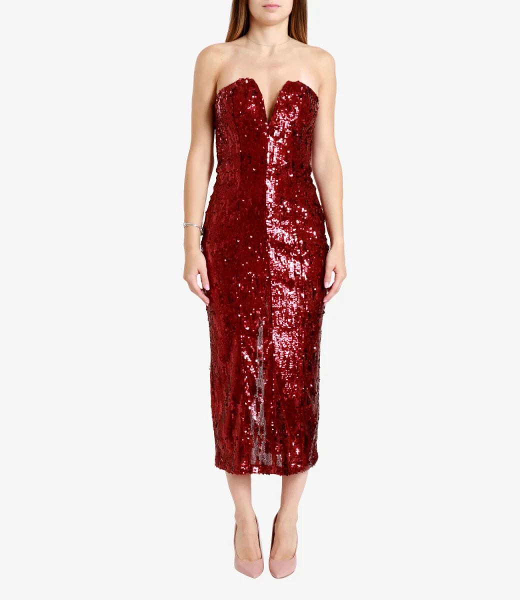 Abito Aniye By Lulu design accattivante interamente realizzato in paillettes. Bustier con scollatura a cuore, silhouette sagomata e avvolgente con prondondo spacco sul retro.