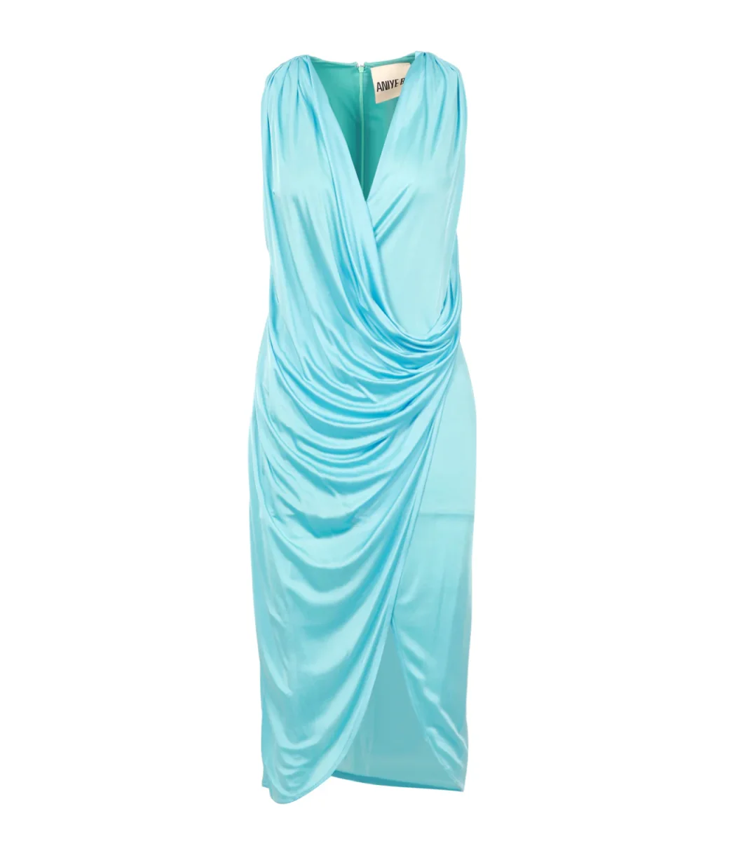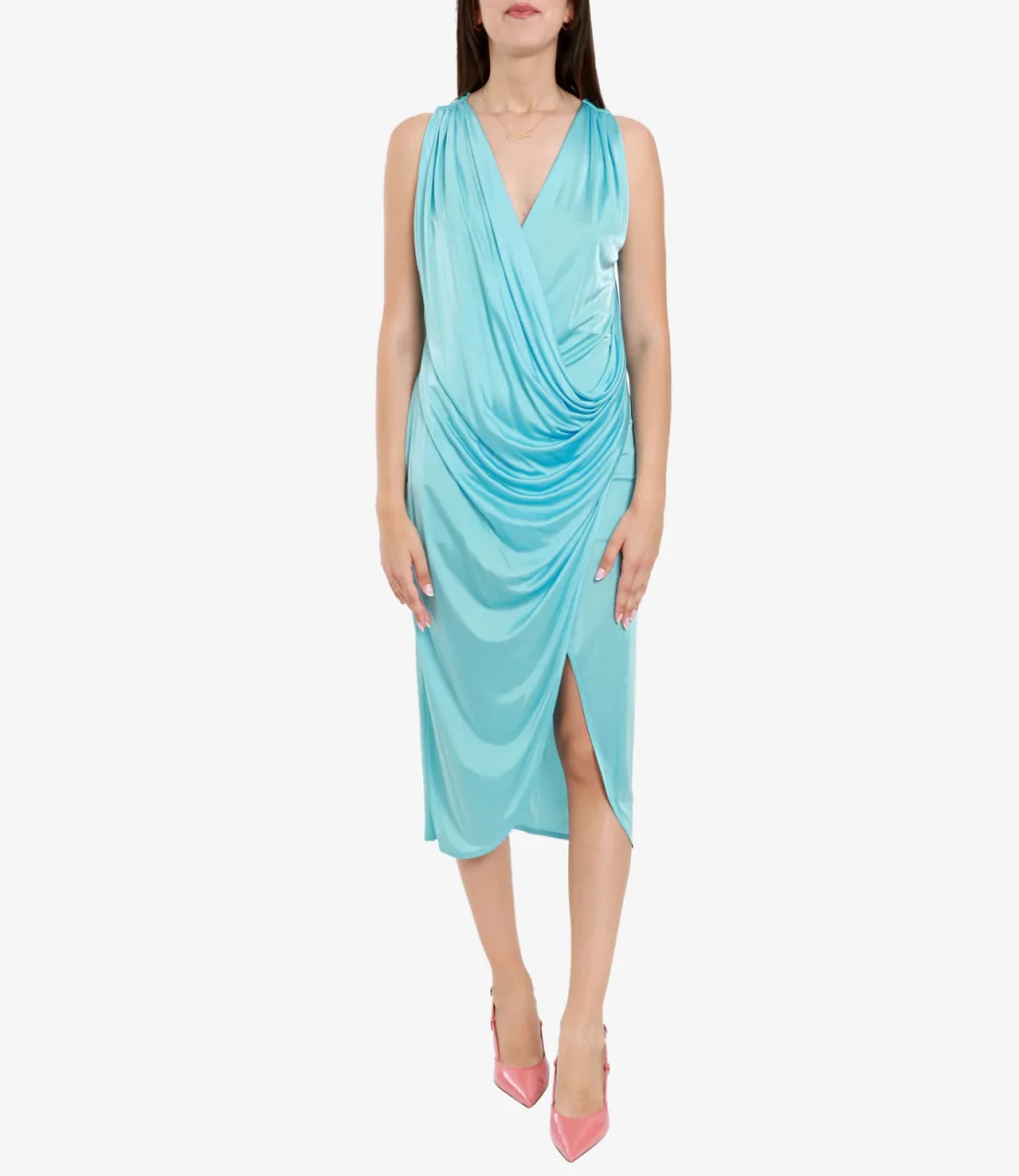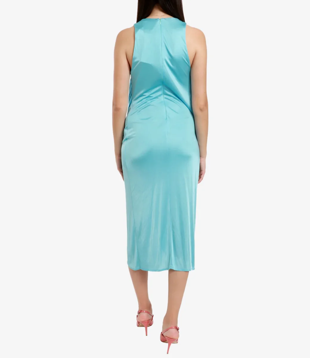 Abito Aniye By in viscosa, smanicato con arriccio laterale e spacco frontale.
