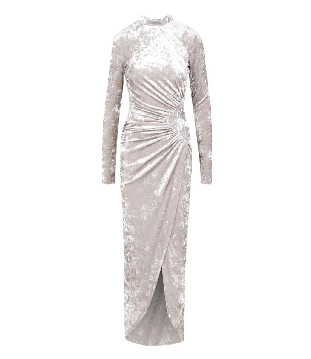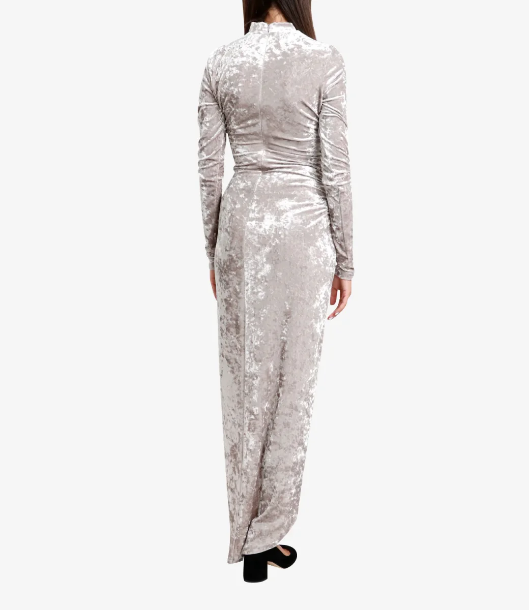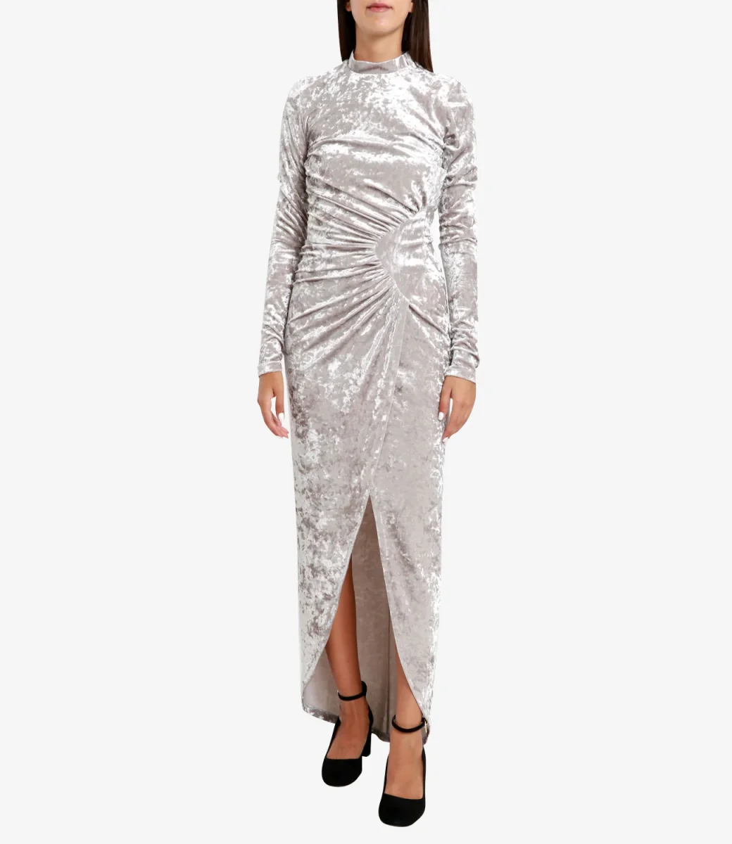 Abito lungo Aniye By in velluto floccato, chiusura posteriore con gancetto e zip nascosti, collo a fascetta, motivo di drappeggio asimmetrico frontale, profondo spacco stondato e sormontato frontale, manica lunga a guanto, foderato con fodera corta in tono colore.