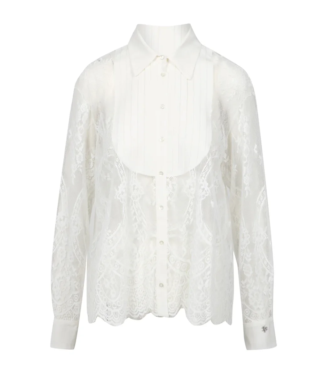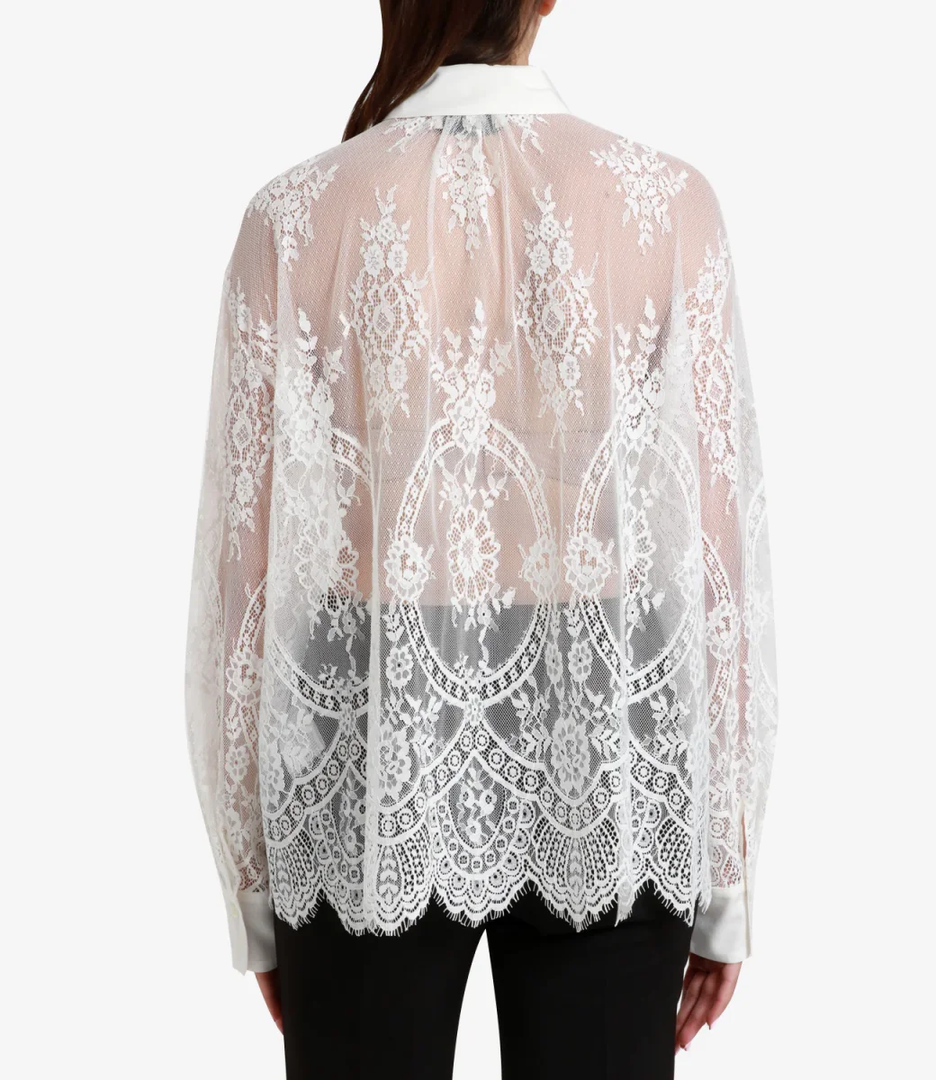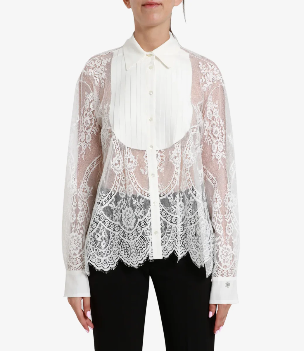 Blusa Aniye By Zelda in pizzo dal fondo irregolare e asimmetrico, più corta sul davanti. Modello morbido, reso caratteristico dal plastron plisettato sul davanti che lo rende un capo unico nel suo genere dal tocco vintage