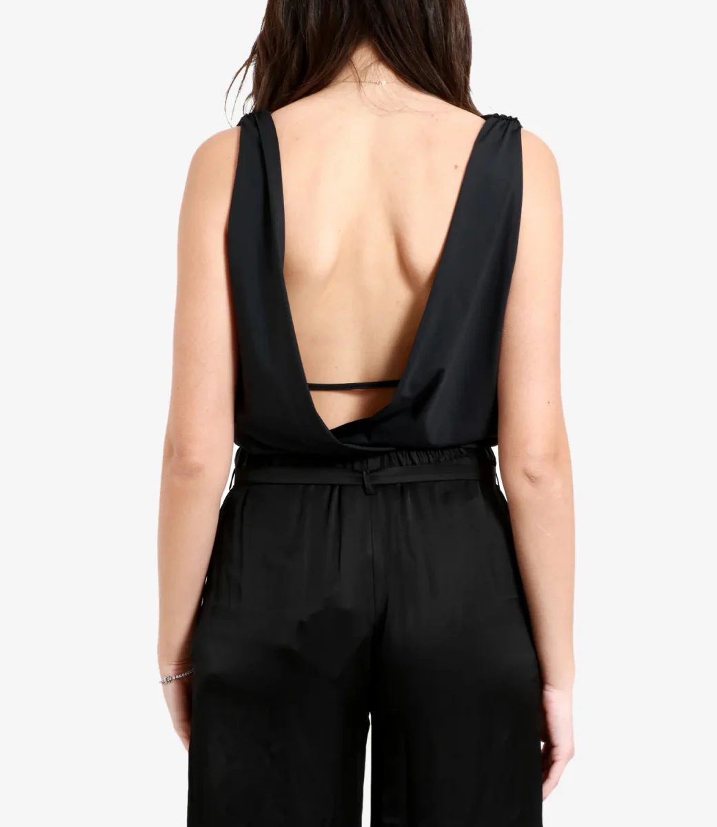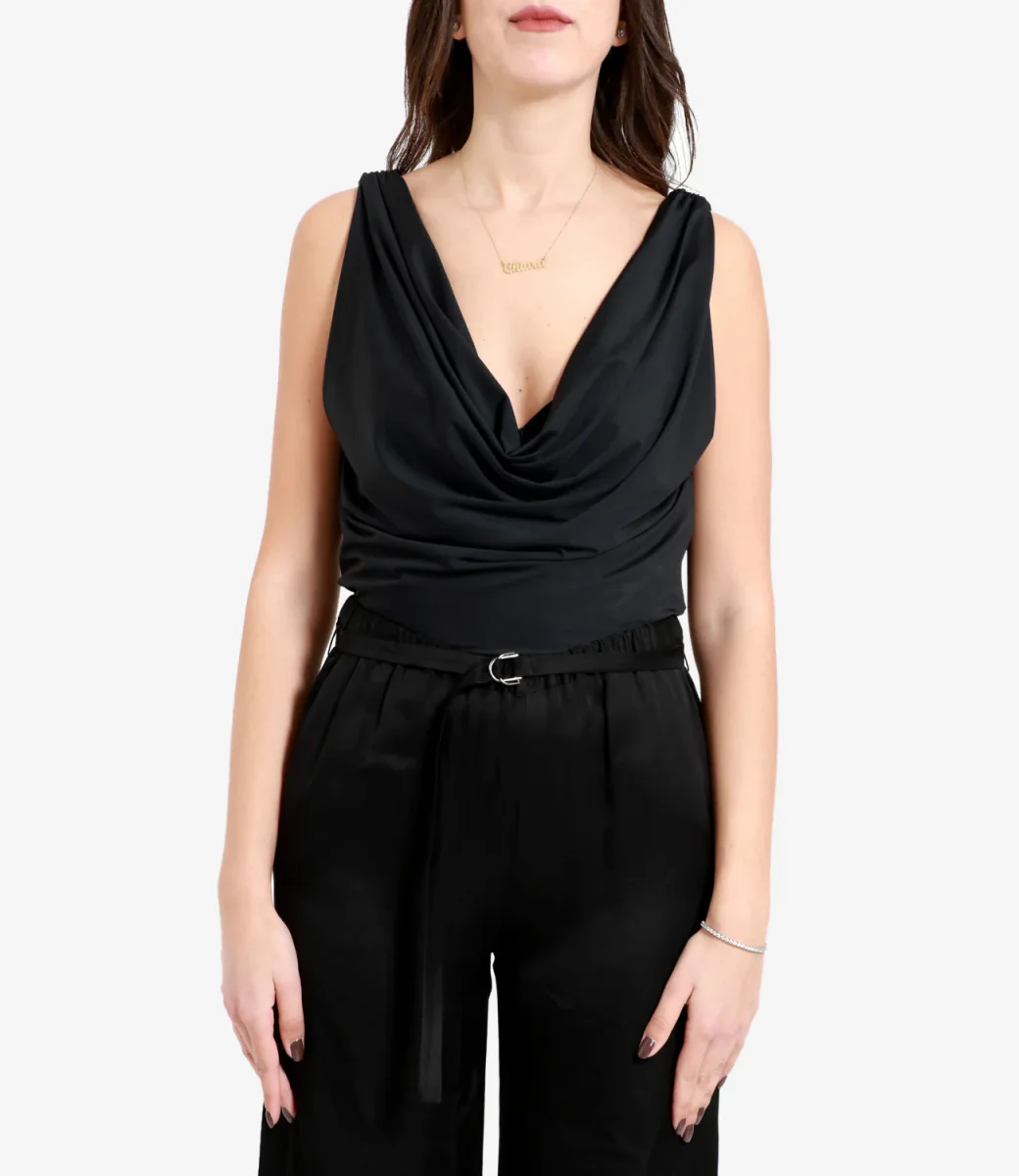 Body Aniye By modello Amal in viscosa, smanicato con scollo arricciato frontale e scollo a v posteriore. La modella è alta 1.75m ed indossa una 40.