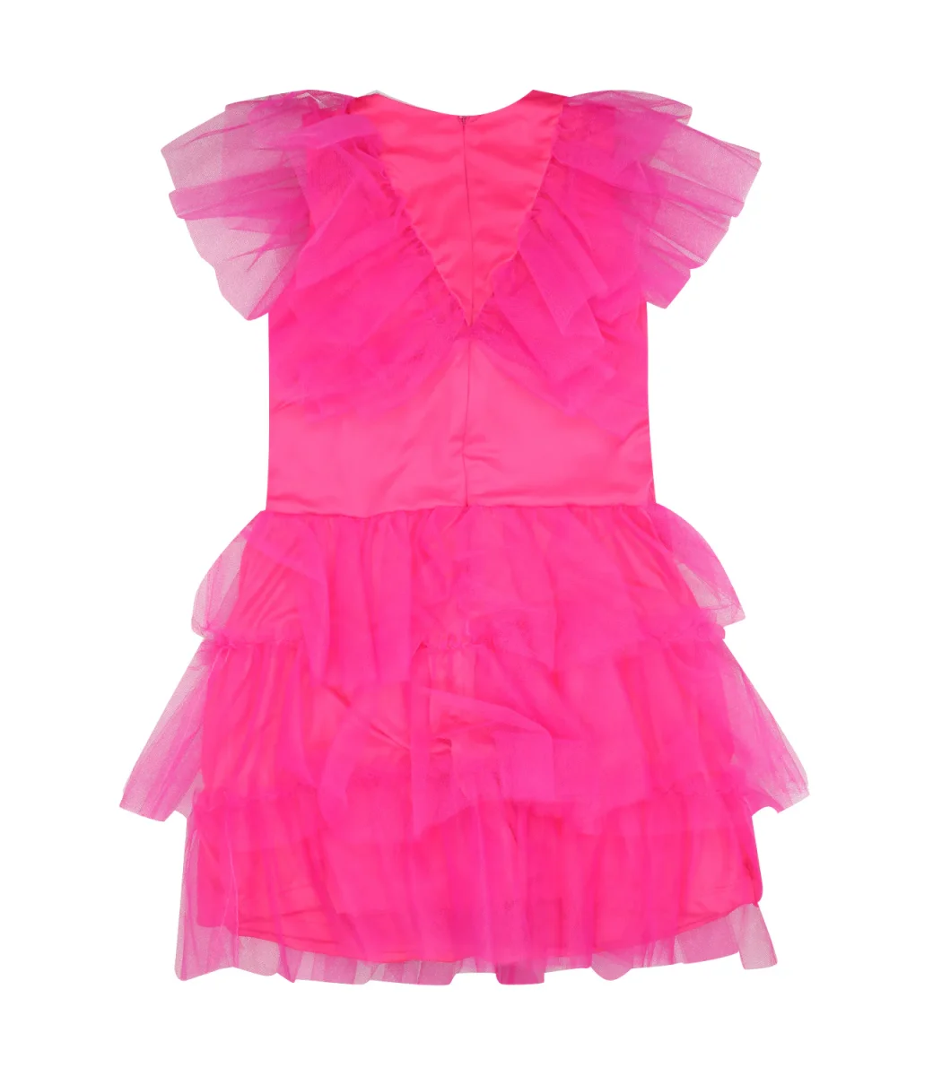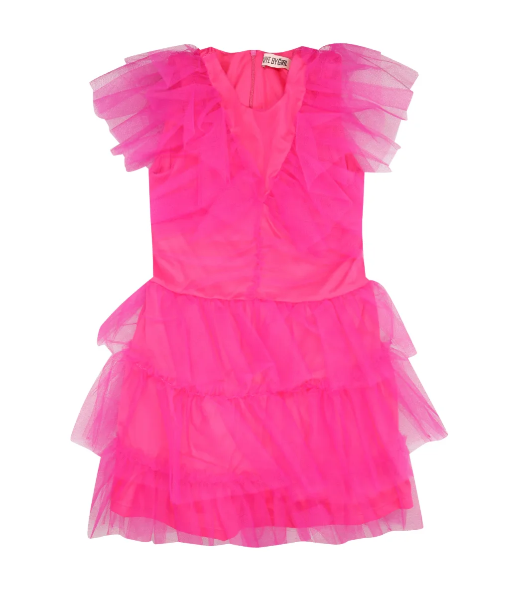 Vestito da bambina, in tulle color fuxia tinta unita.Modello in giromaniche, dettaglio rifiniture in tulle tinta su tinta. Vestibilità regolare.