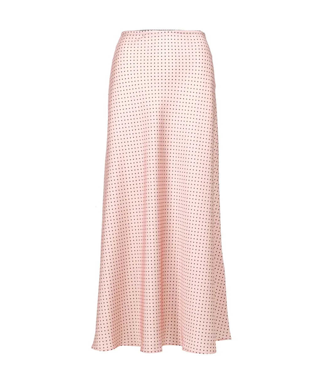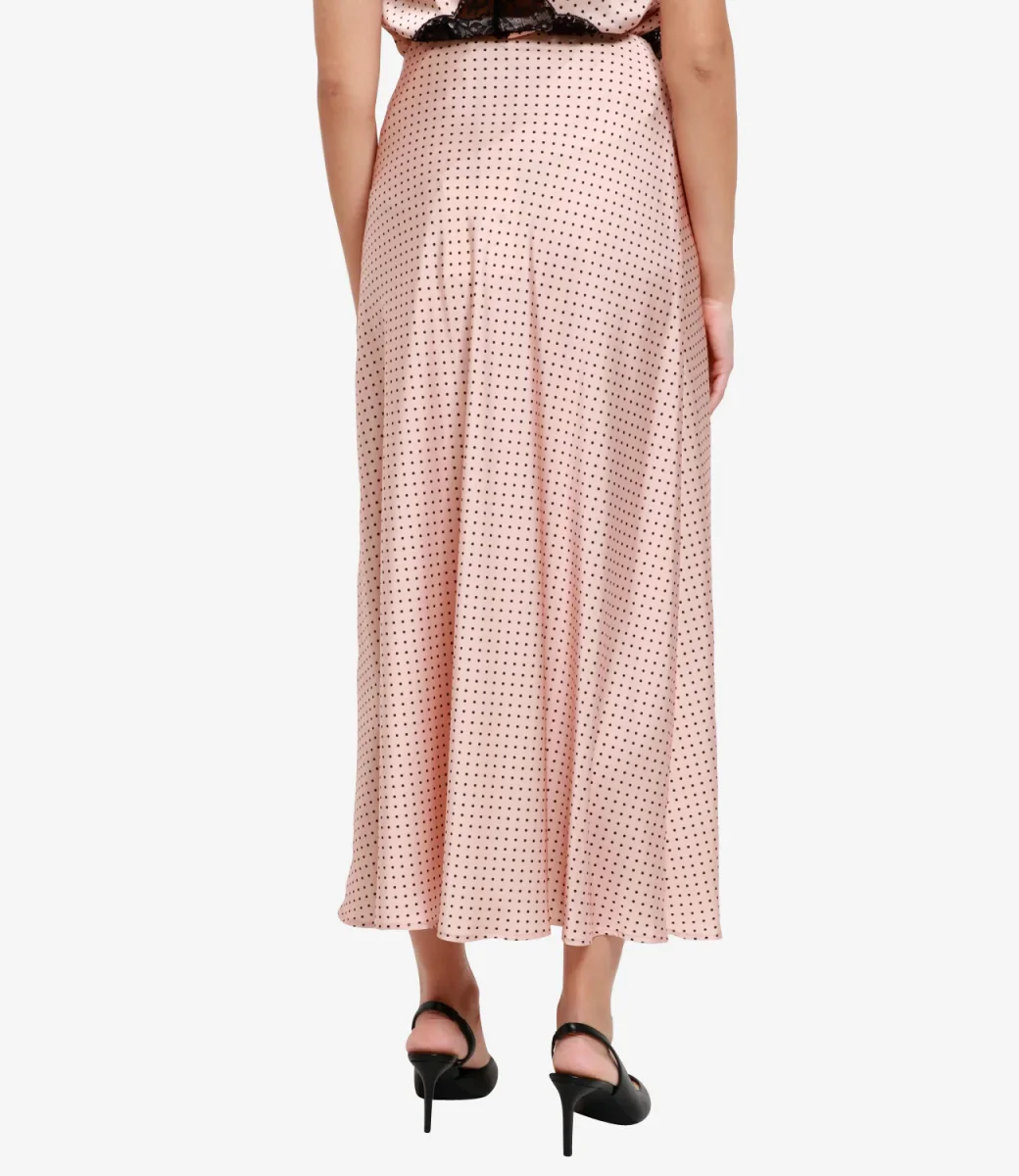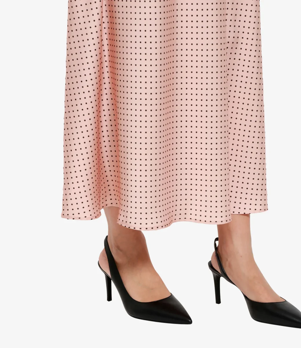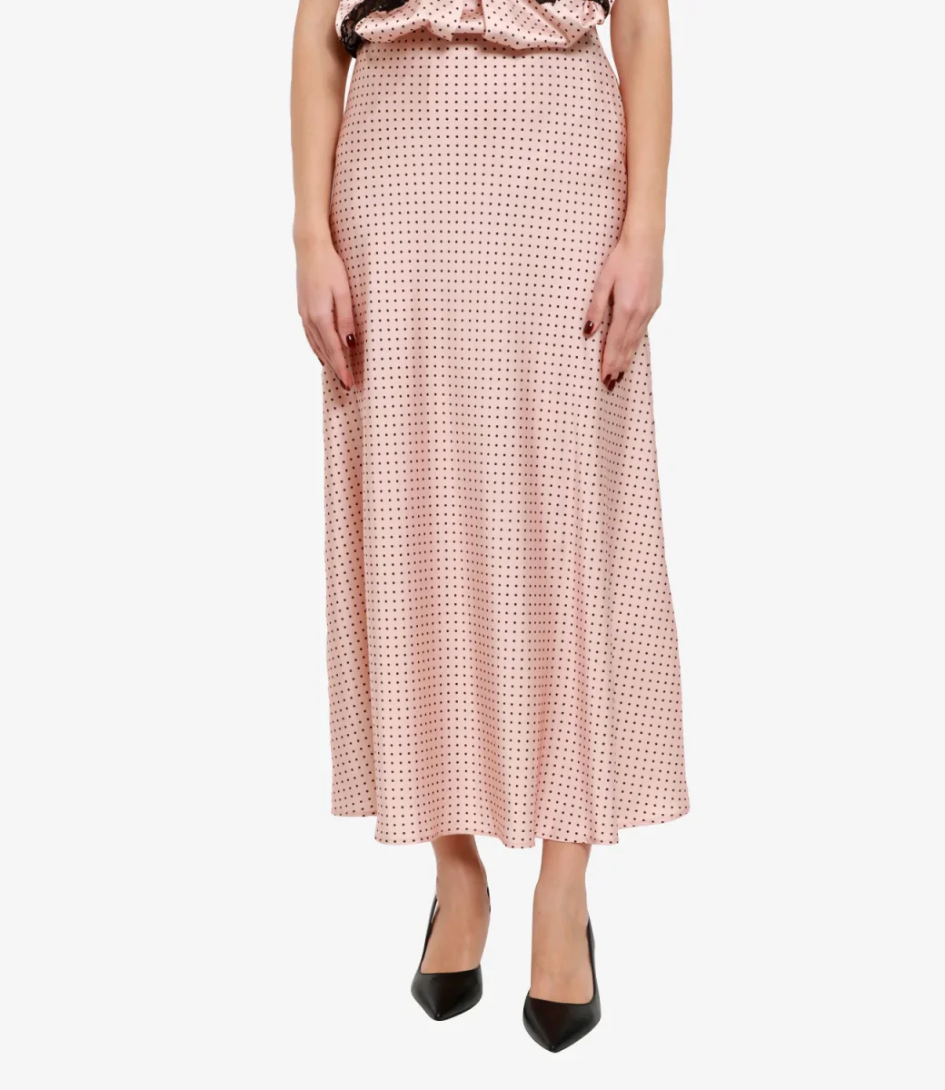 Gonna Aniye By Leonie realizzato in raso con fantasia a pois, modello lungo alla caviglia. Linea dritta a vita regolare, fondo con orlo dritto.