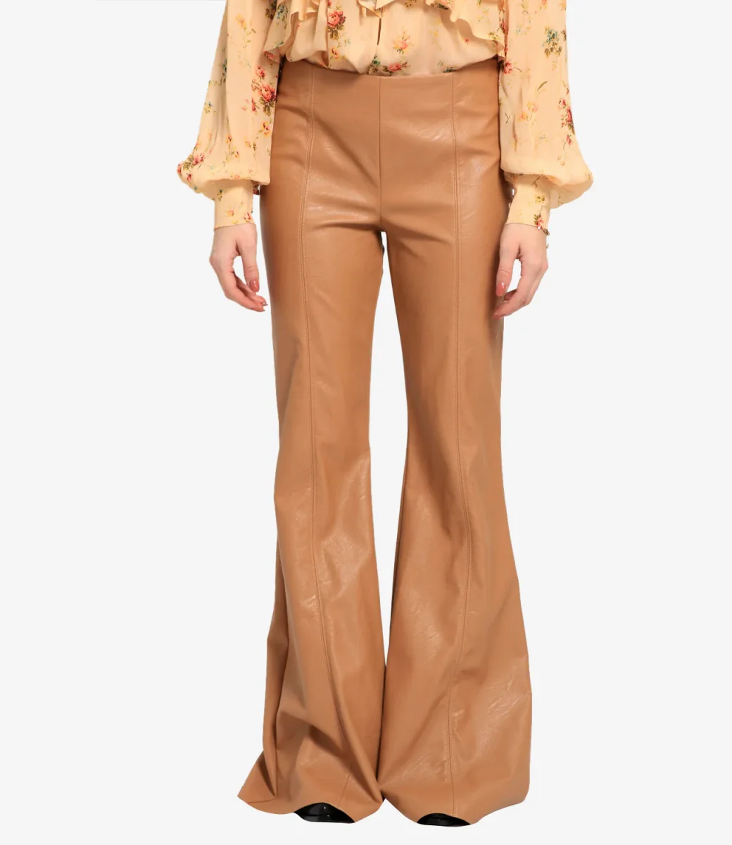 Pantalone a zampa in ecopelle con cerniera invisibile sul fianco.