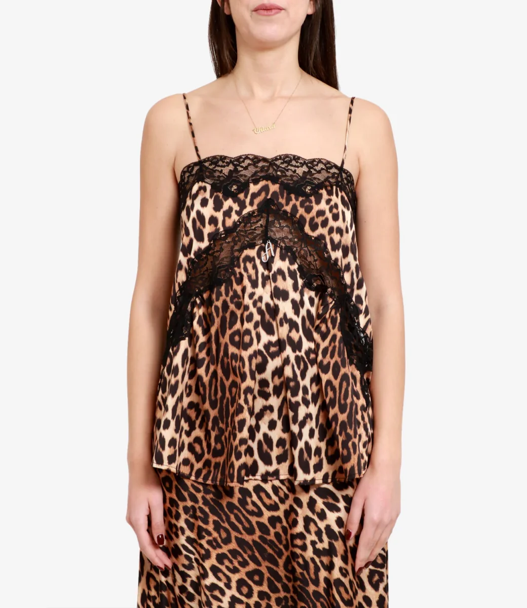 Top Aniye By Leonie tessuto rasato in fantasia animalier e inserti in pizzo per un outfit dal carattere glam, modello lungo con piega unica centrale sul davanti e sul retro per donare un effetto morbido.