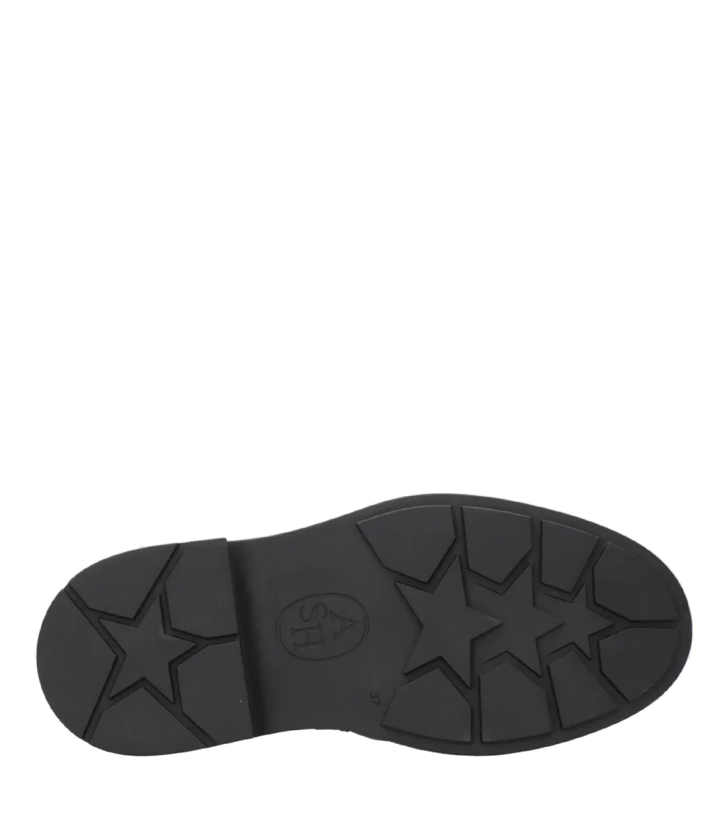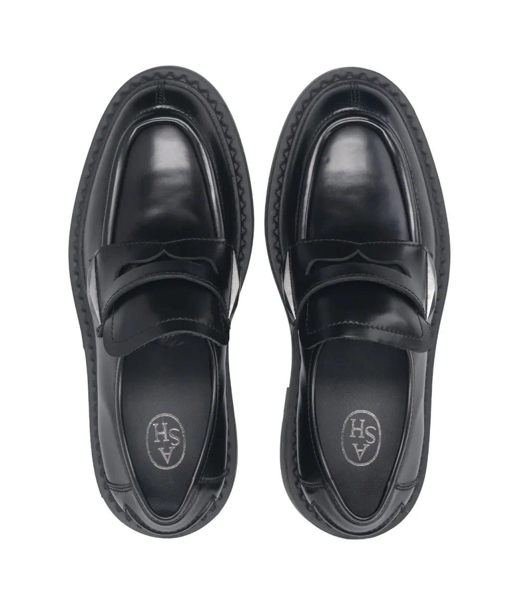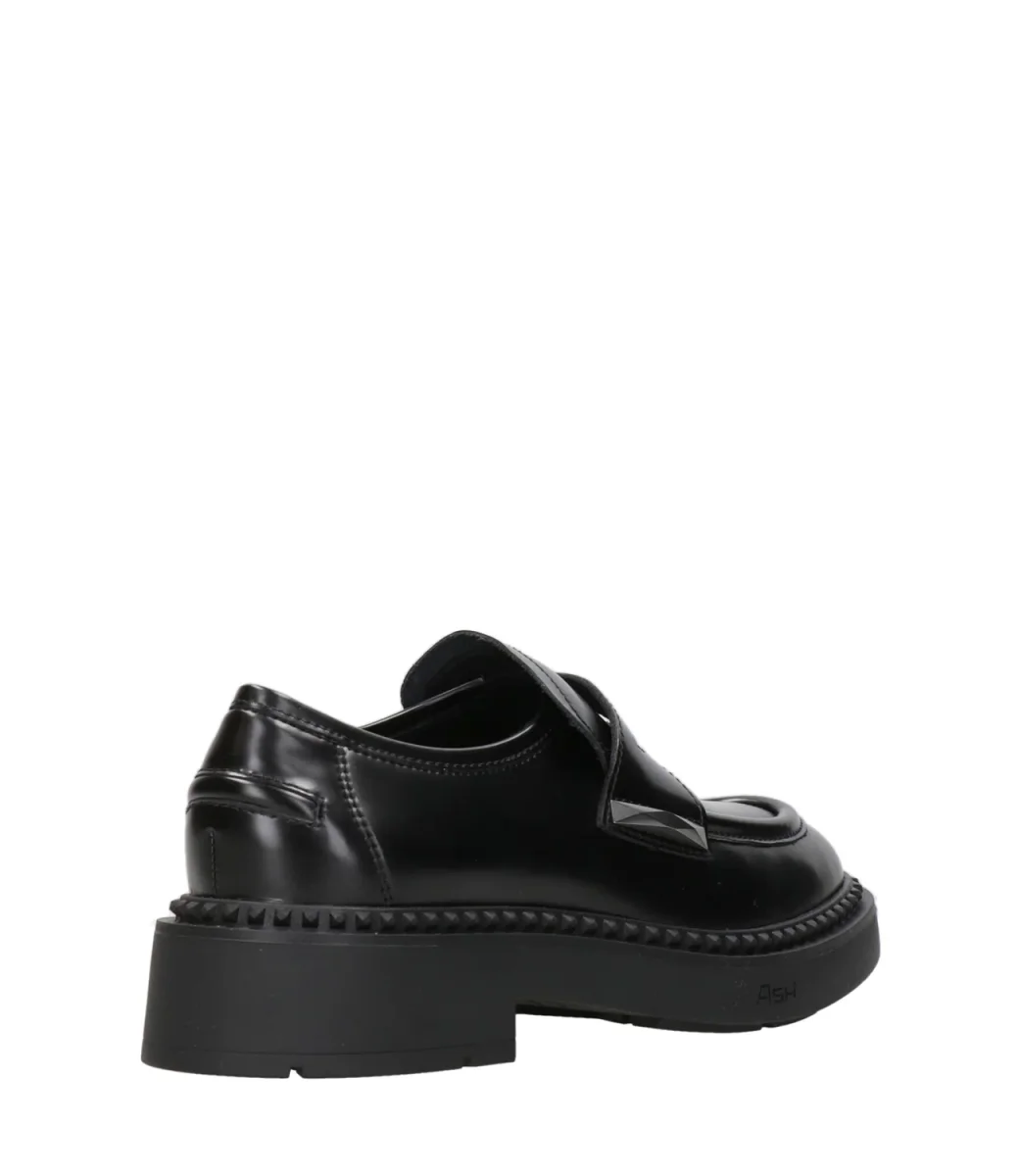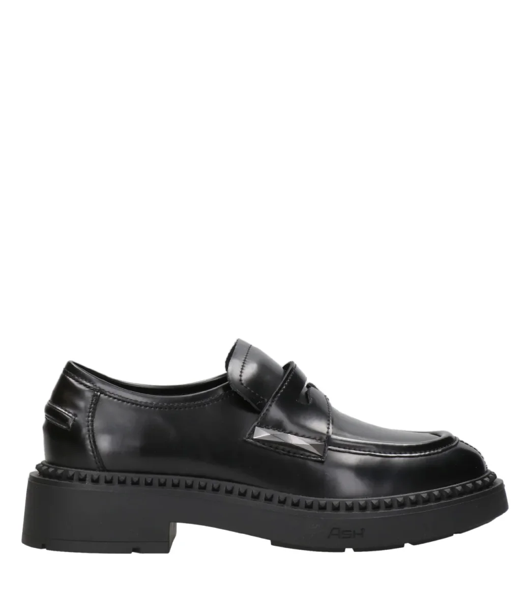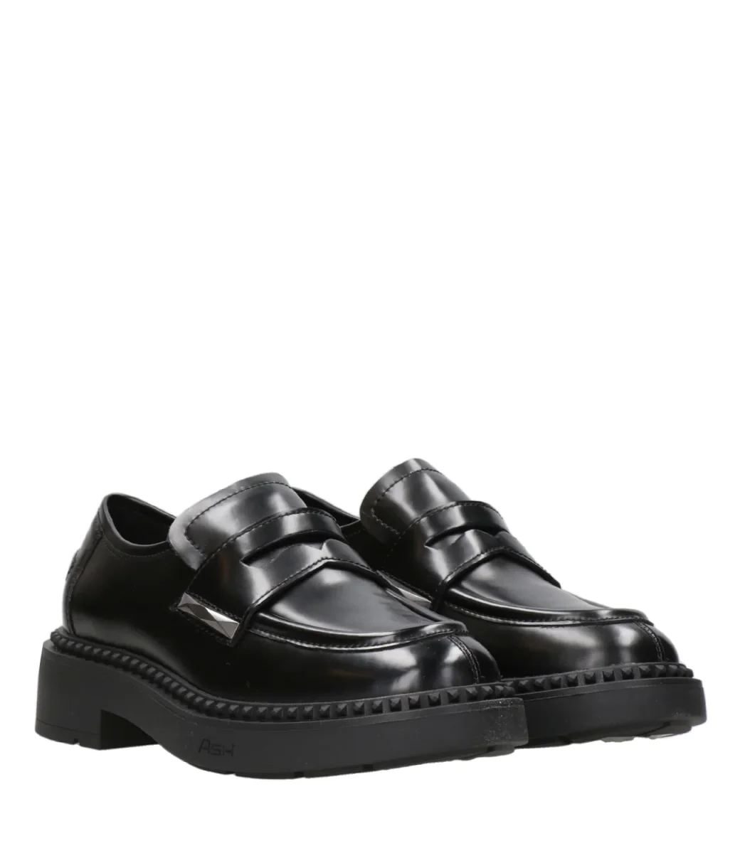 Mocassino Ash Main Britney in pelle, caratterizzato da una suola in gomma con tacco alto e mascherina con bordi imbottiti, decorato con borchie in gomma su tutto il perimetro del fondo. Internamente è foderato in pelle. Linea college