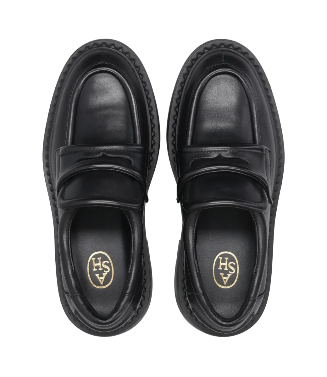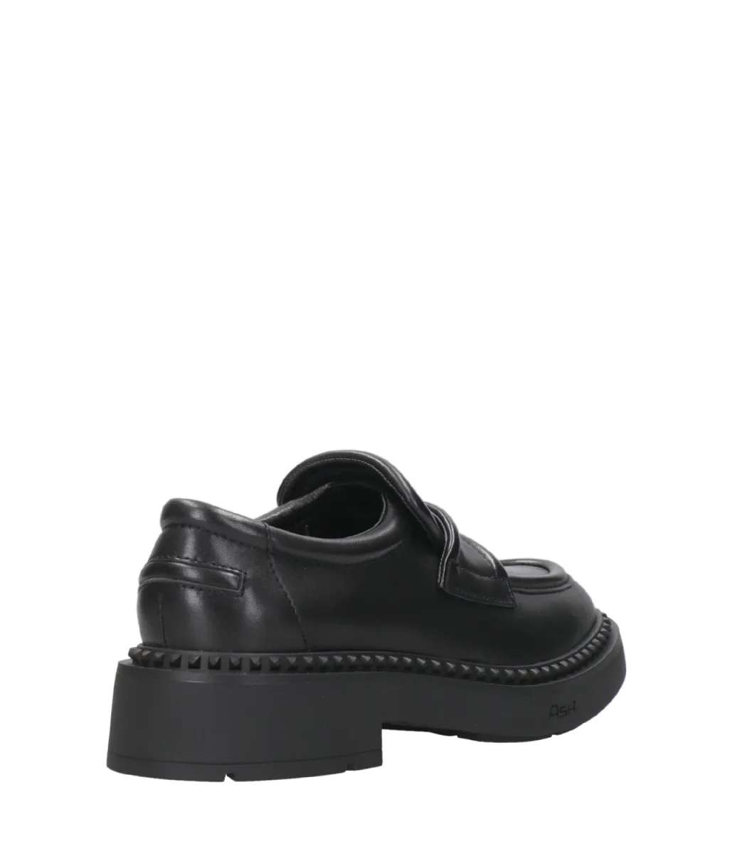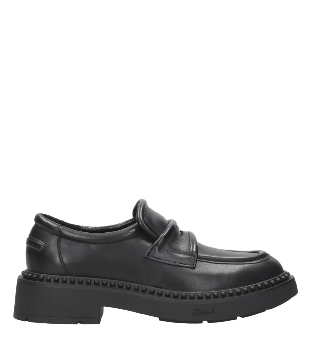 Mocassino Ash Main Miracle , linea college in pelle, caratterizzato da una suola in gomma con tacco alto e mascherina con bordi imbottiti, decorato con borchie in gomma su tutto il perimetro del fondo. Internamente è foderato in pelle.