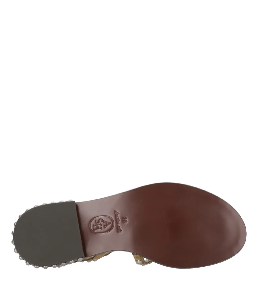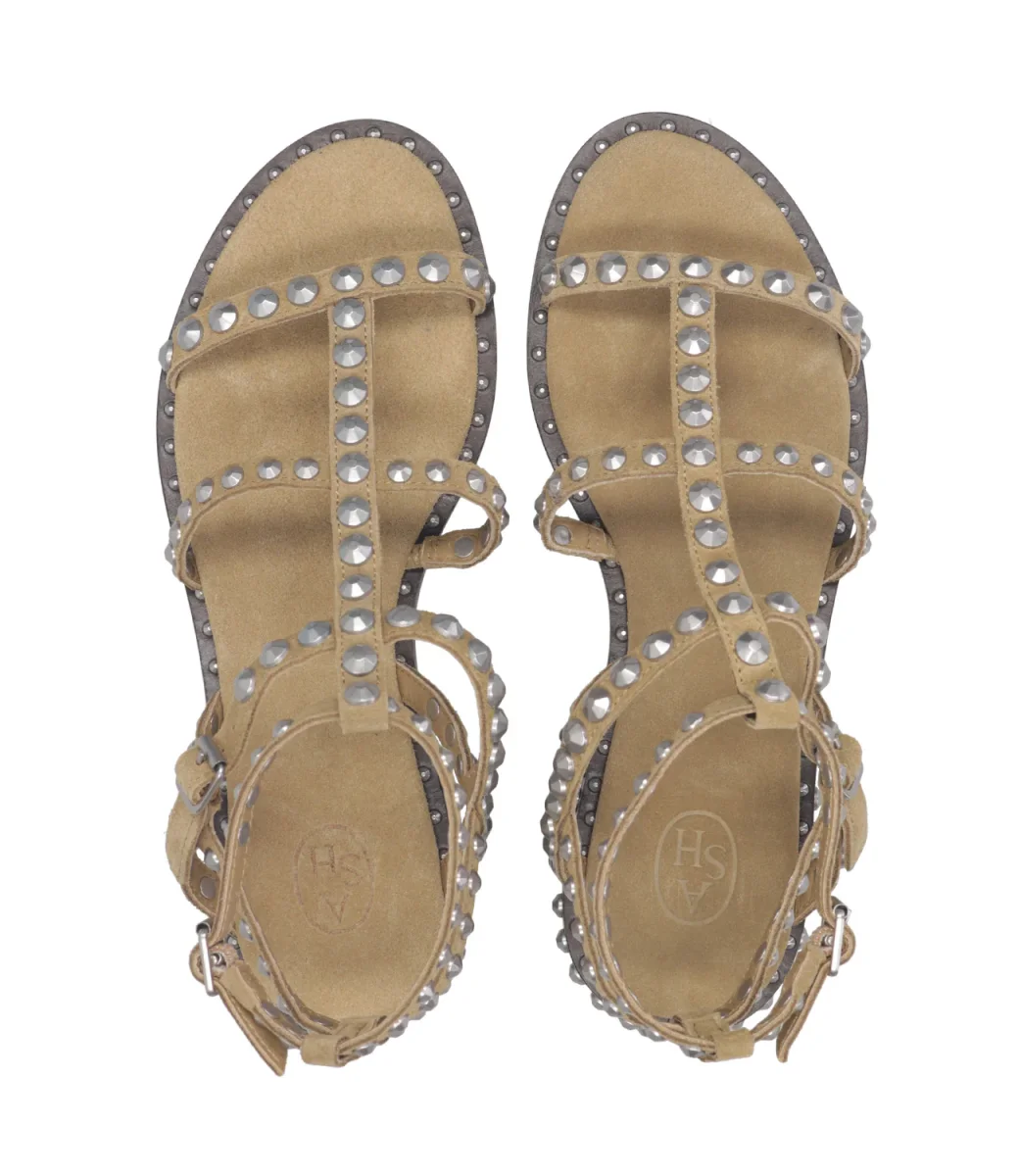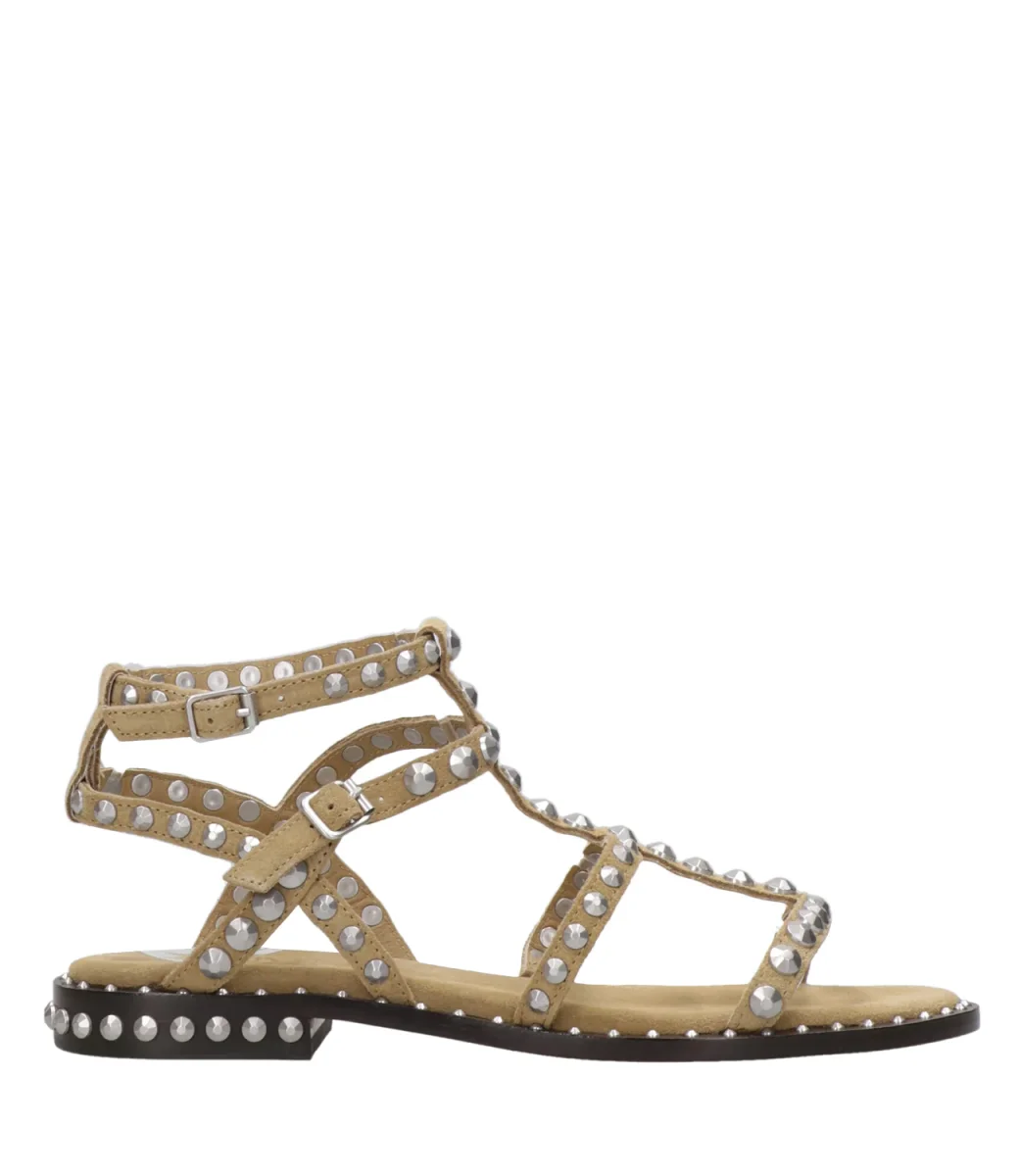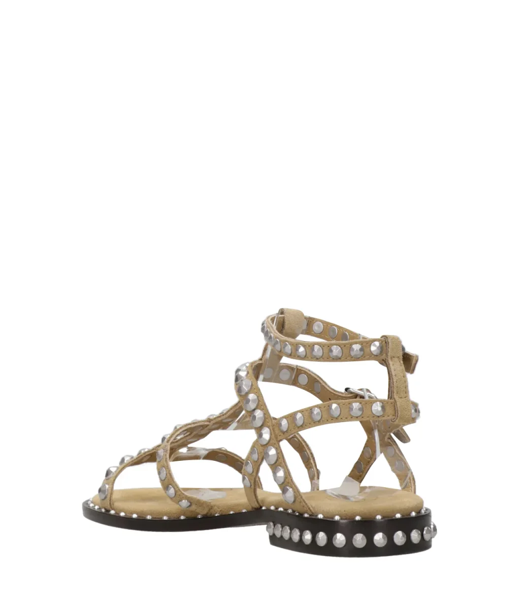 Sandalo Ash Main in pelle con doppi cinturini alla caviglia, tomaia e tacco decorati con borchie in dorate, suola in cuoio.