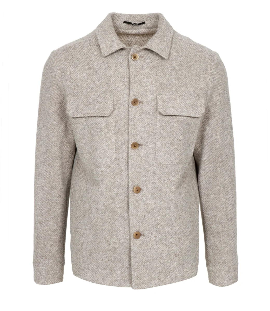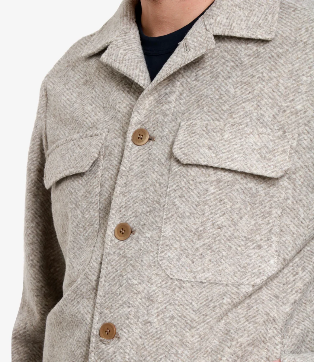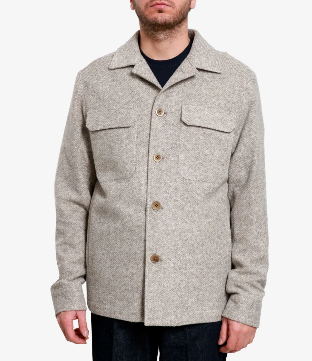 Giacca At.P.Co Orlando overshirt di tendenza dal carattere deciso in tessuto spigato misto lana. Collo classico con chiusura a bottoni, tasche con patta sul petto e laterali a filetto. Maniche lunghe con polsini a bottone.