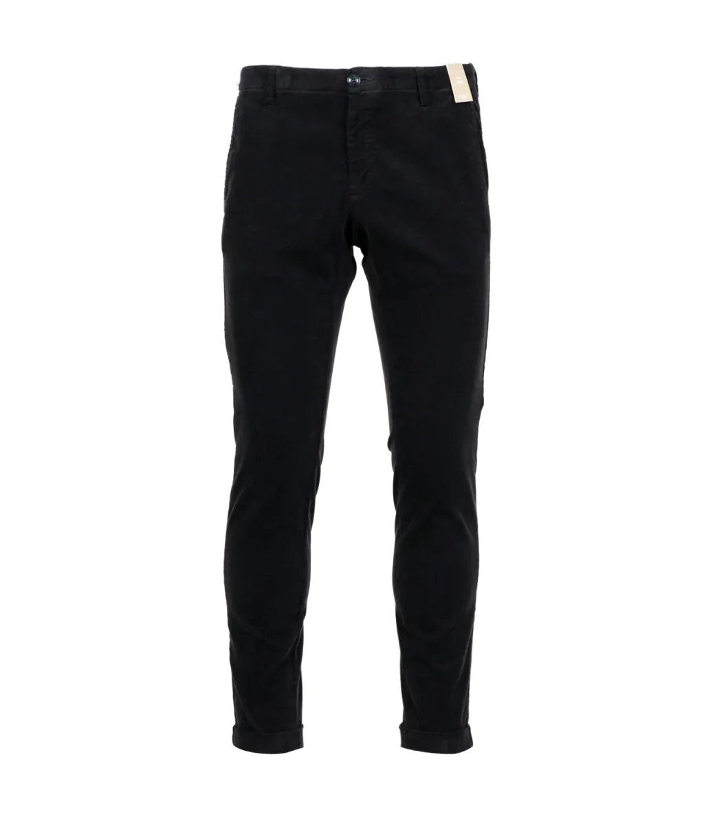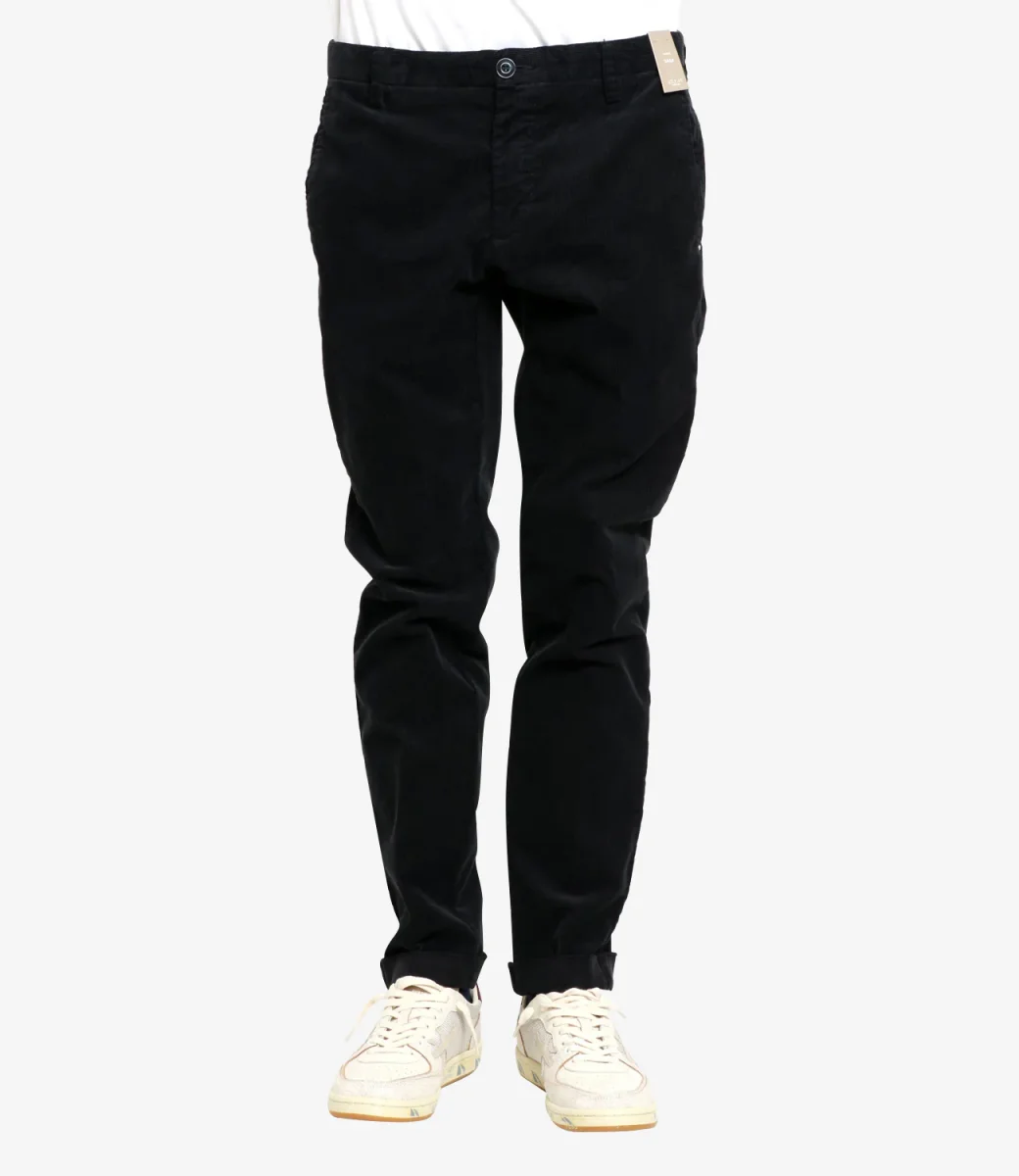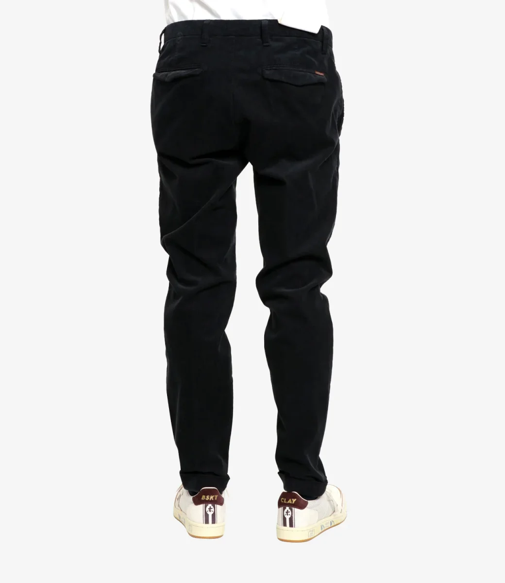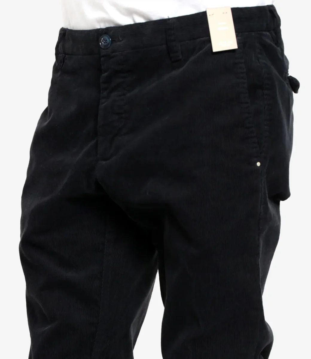 Pantalone At.P.Co Sasa in velluto rasato stretch, vita regolare con passanti, tasche alla francese, chiusura con bottone e zip con patta, tasche con patta sul retro con logo applicato sul bordo.