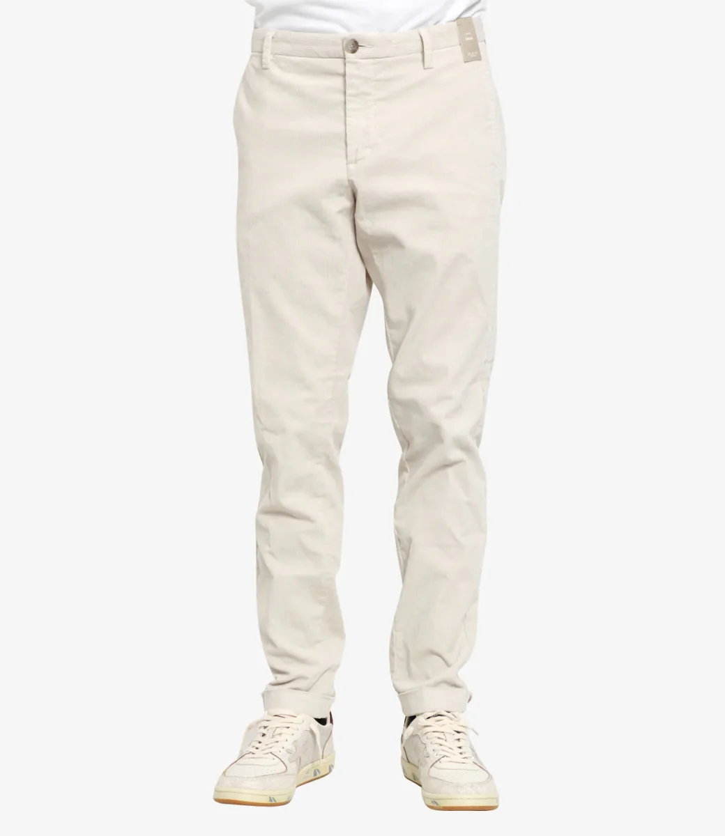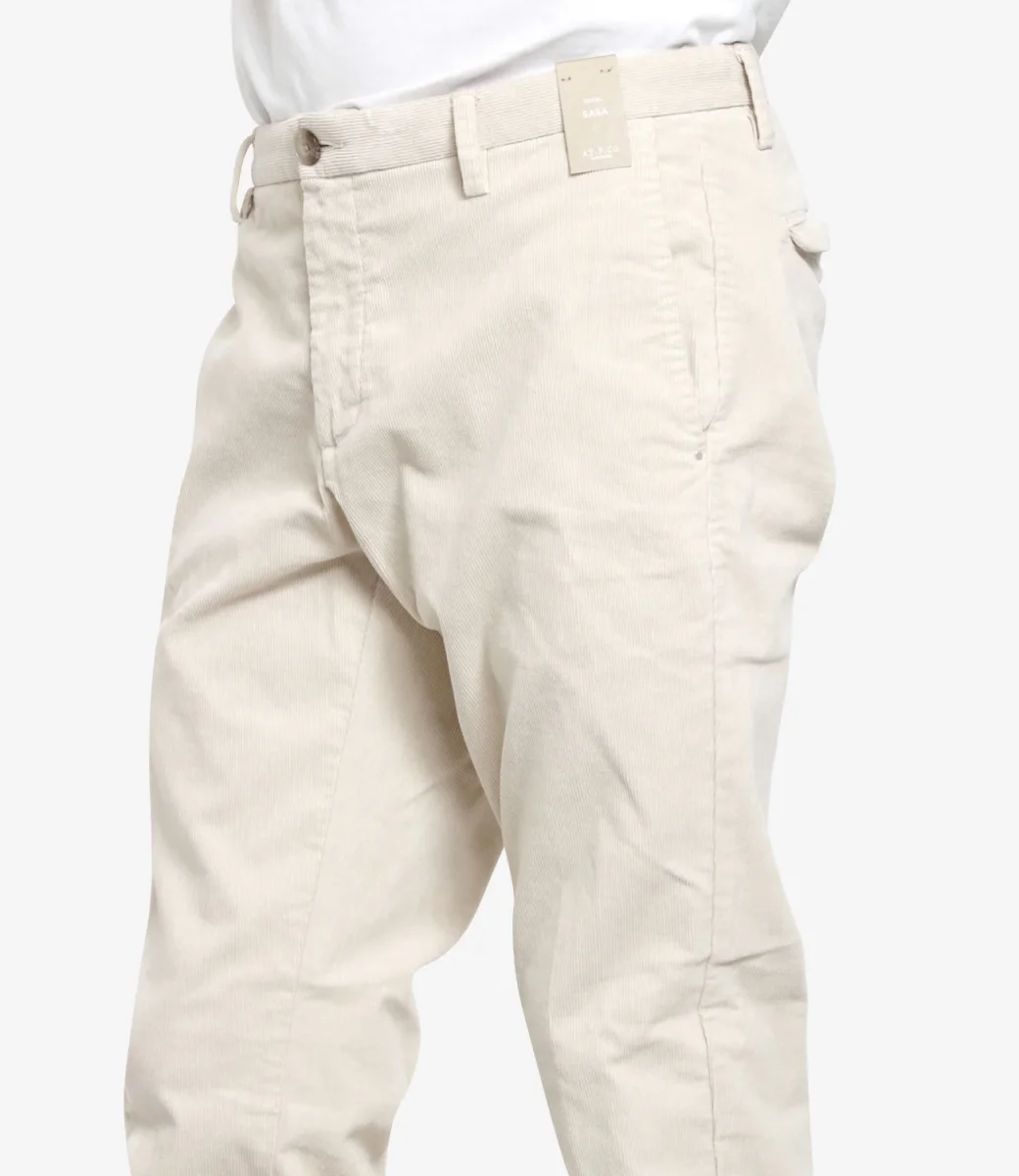 Pantalone At.P.Co Sasa in velluto rasato stretch, vita regolare con passanti, tasche alla francese, chiusura con bottone e zip con patta, tasche con patta sul retro con logo applicato sul bordo.
