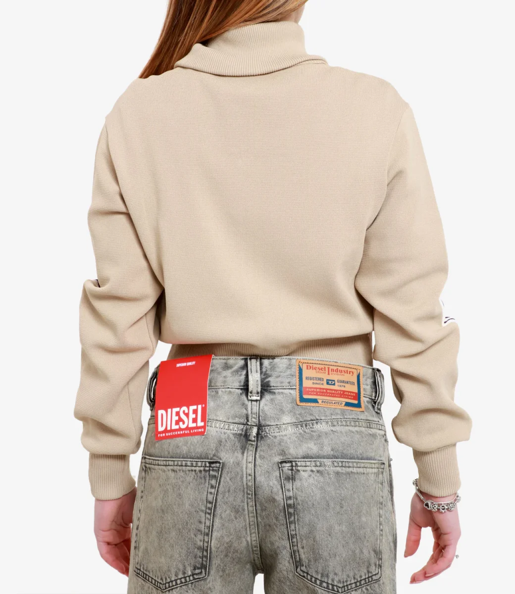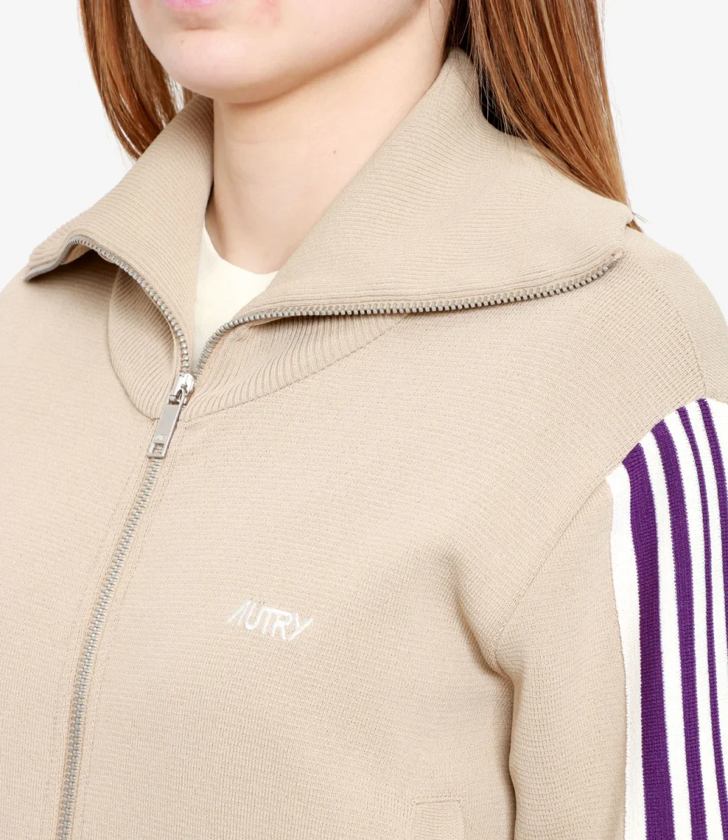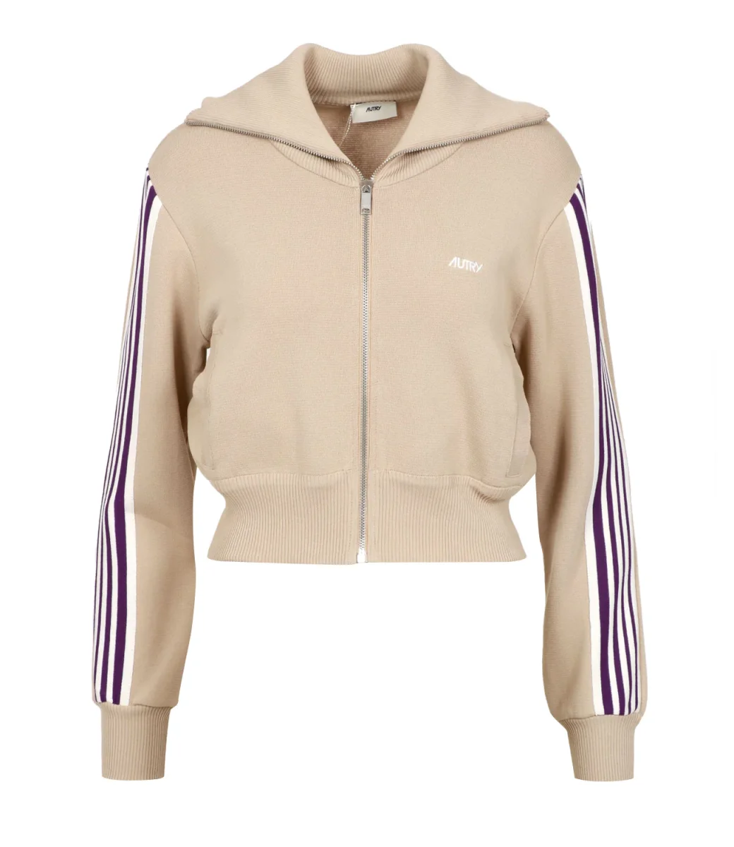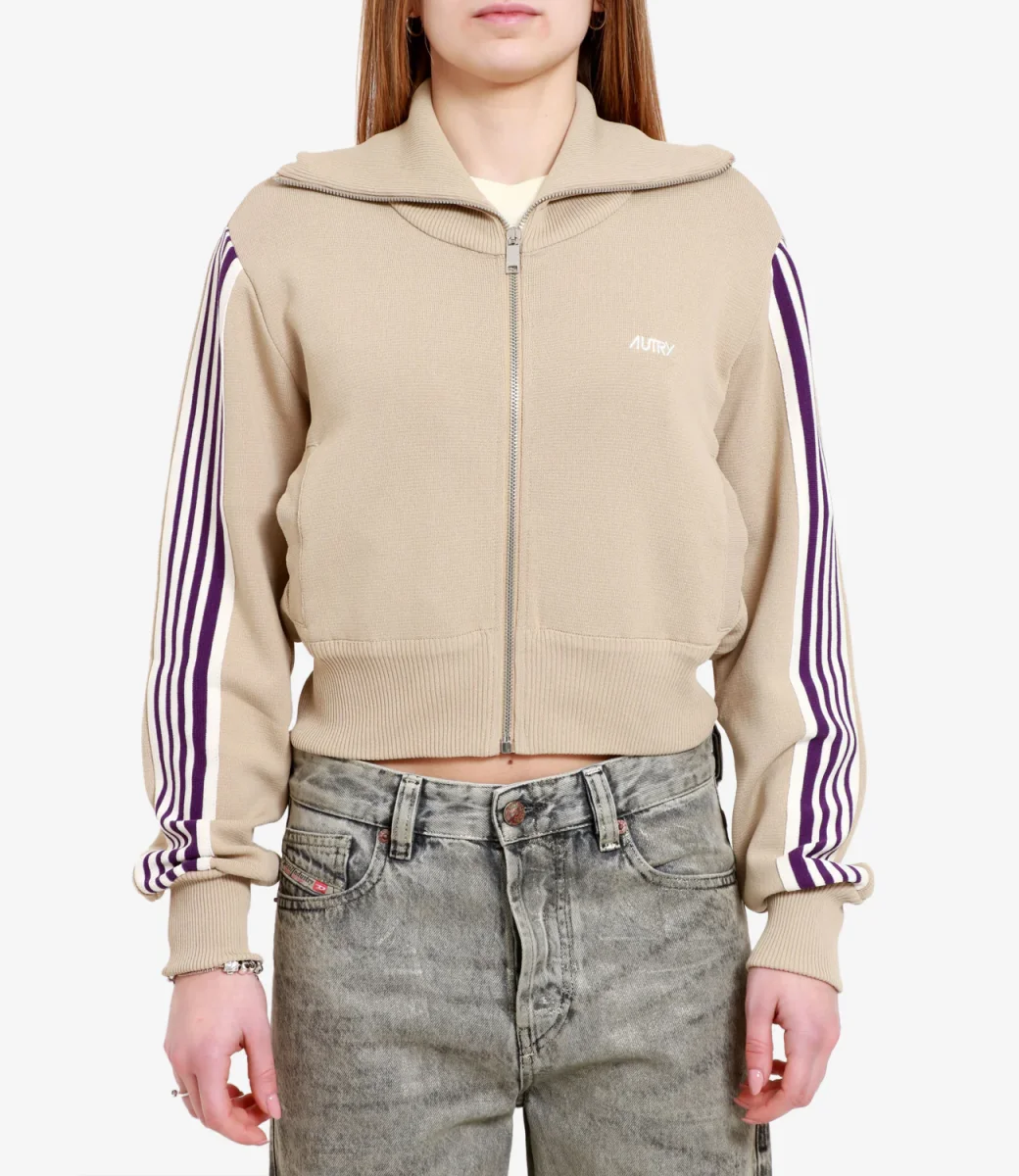 Felpa Autry in tessuto rètro per una moda anni ’70 sempre di carattere, collo ampio a costine, chiusura con zip, bande colorate sulle maniche e fondo a costine.