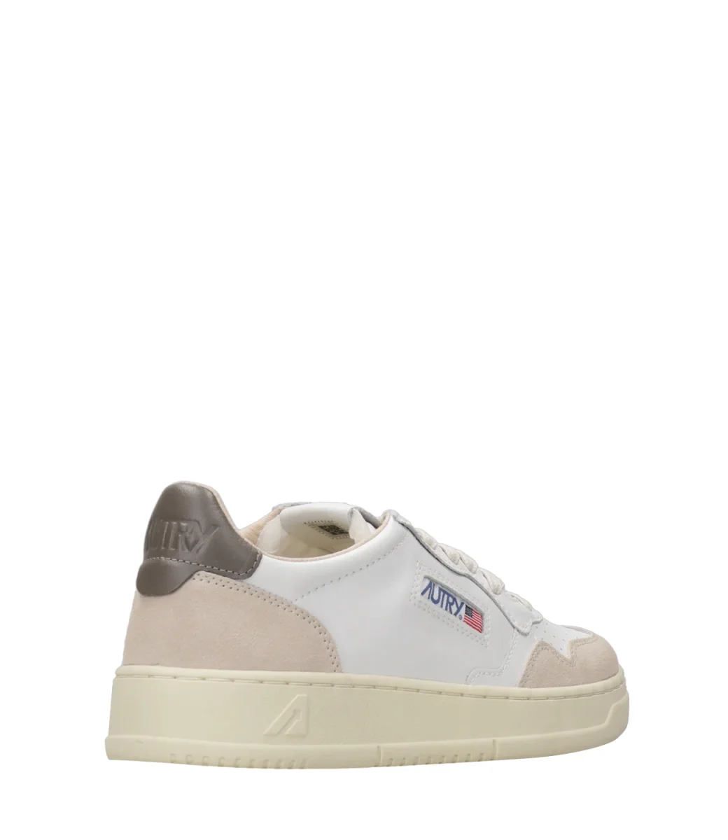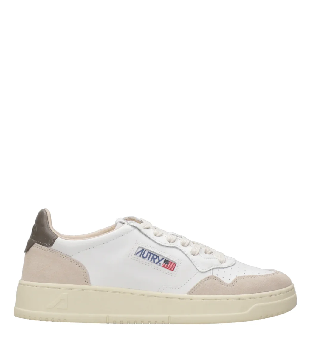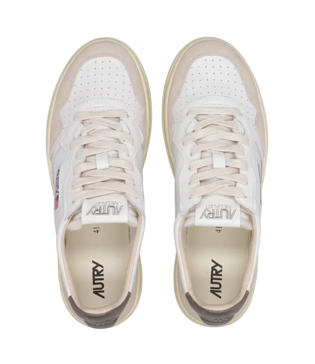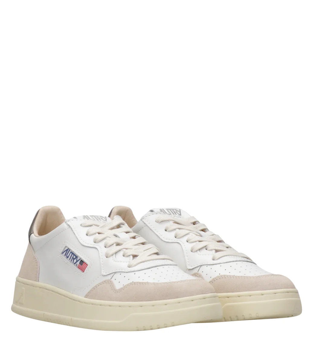 Sneakers Autry Medalist Low Man bassa. Modello vintage anni 80, in pelle con punta tonda traforata. Topponcino retro caviglia con logo Autry.
