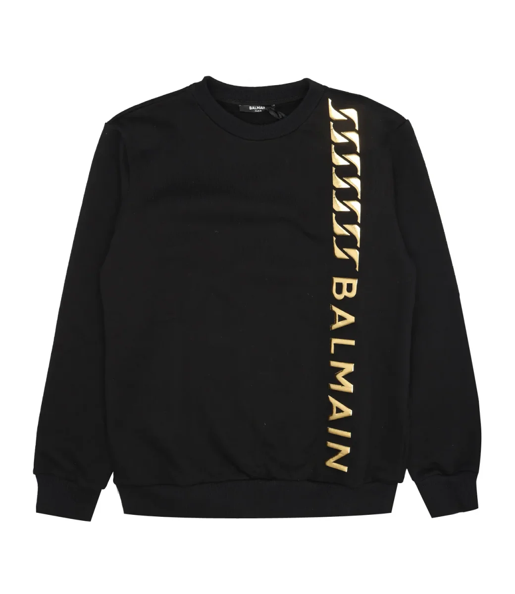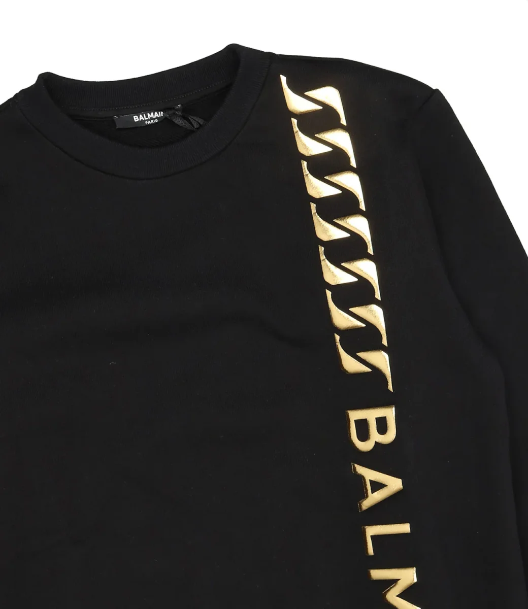 Felpa Balmain marchio francese di lusso, realizzata in jersey di cotone sostenibile nero, con un classico girocollo, con finiture elasticizzate per il massimo comfort. Sul fornte, stampa a contrasto logo vertical lettering Balmain e l’immagine di una catena sul lato sinistro,