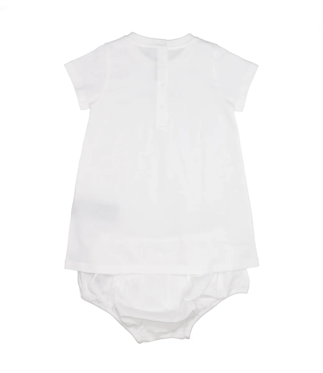 Dettagli:– Cotone– Girocollo– Maniche corte– Tinta unita– Chiusura posteriore con bottoni automatici– Logo frontale stampato– Culottes incluse