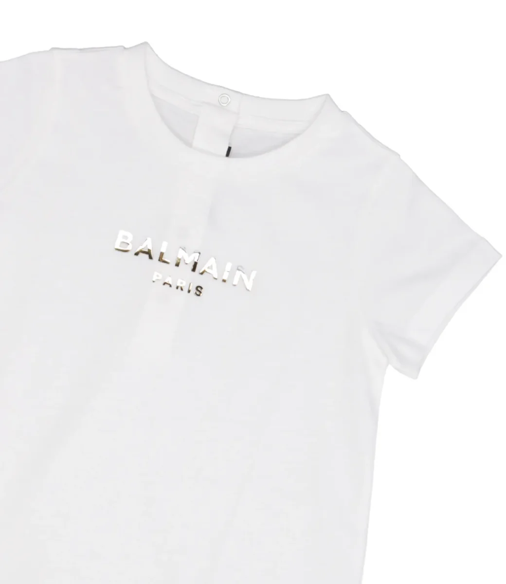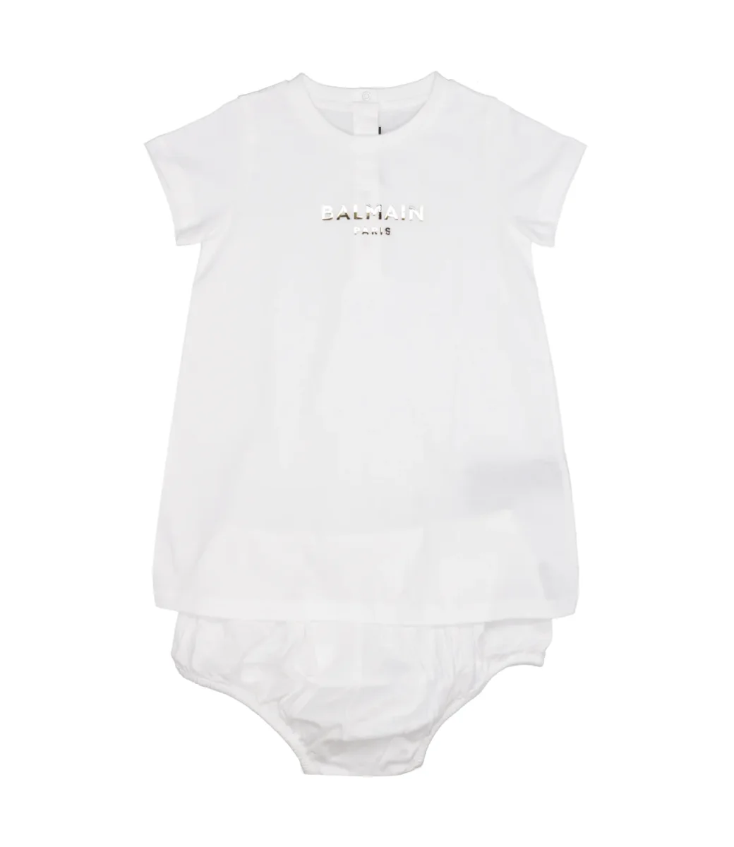 Abito Balmain Kids in cotone a tinta unita con logo frontale stampato.