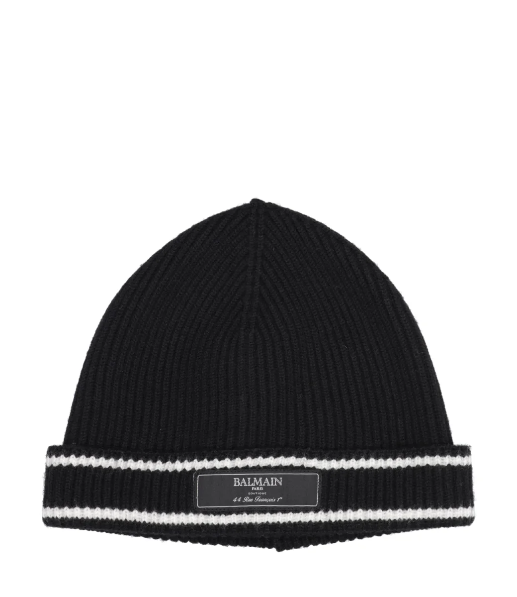 Cappello Balmain Kids in lana, lavorazione a coste, logo patch applicato sul davanti, con risvolto, bordo bicolore.