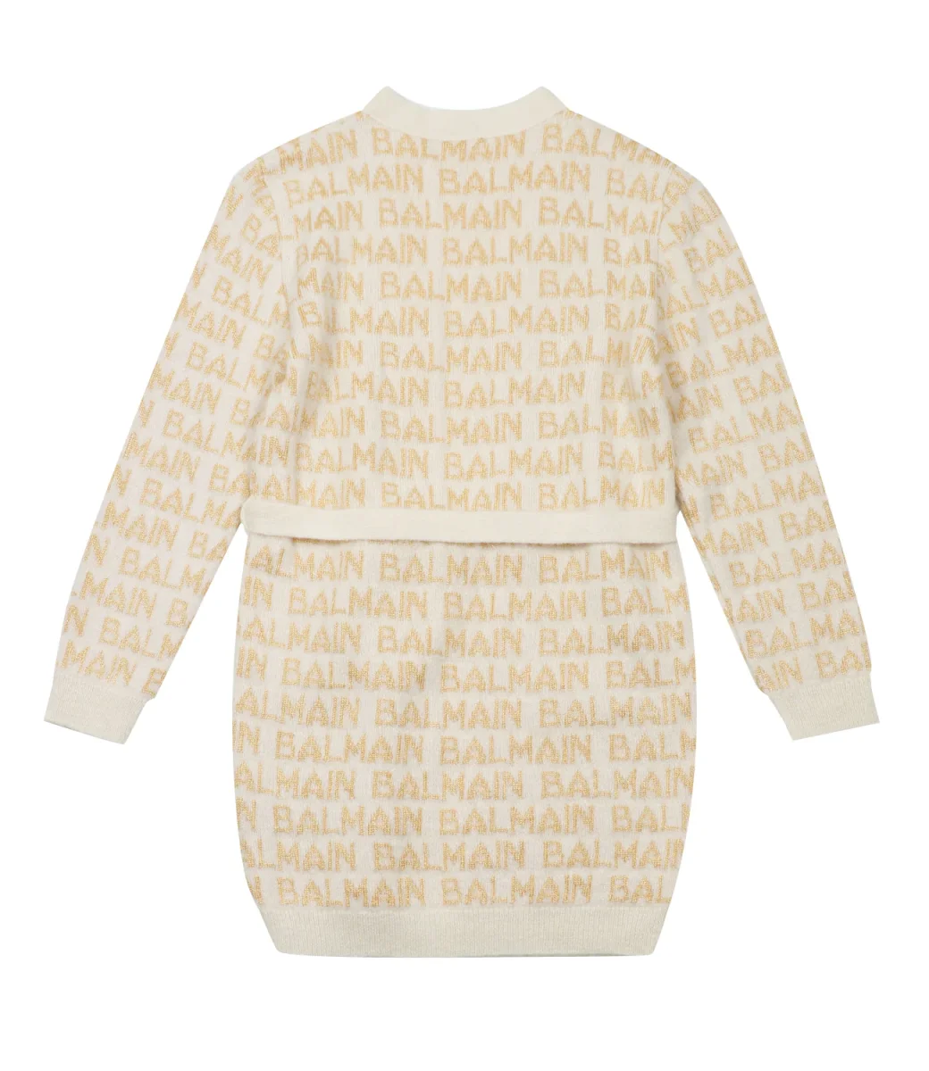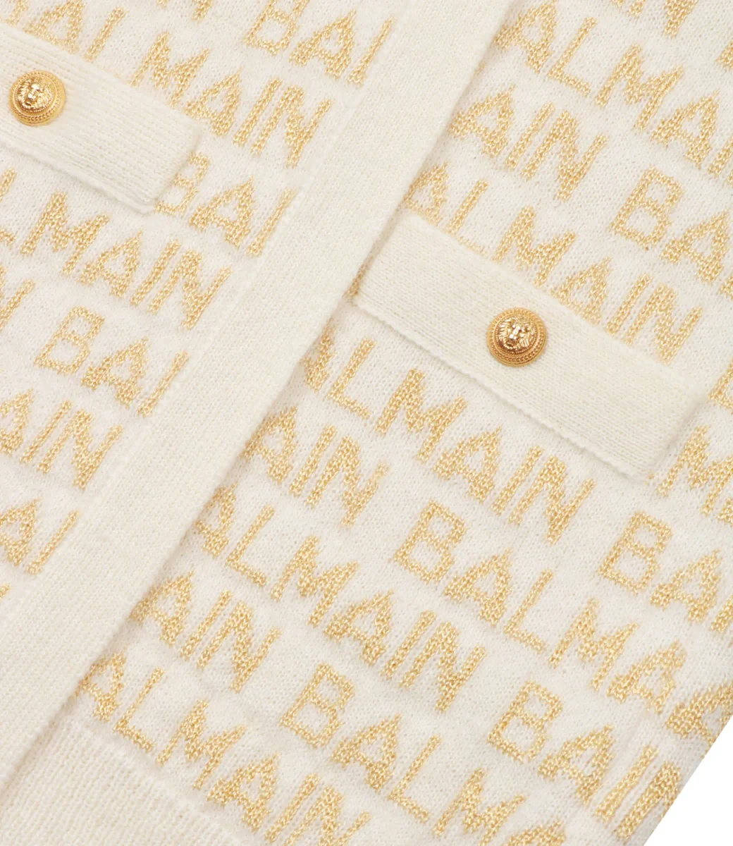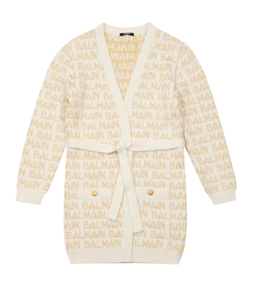 Cardigan Balmain Kids in cotone con maniche lunghe e cinta in vita, tasche con patta e bottoni, logo stampato all over, orlo e polsini elastici.