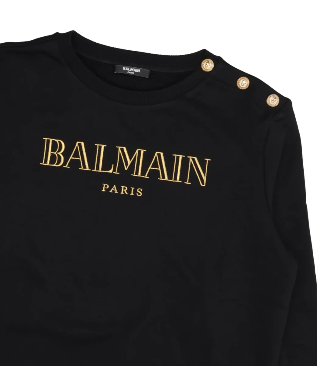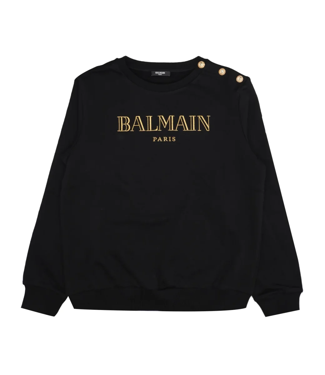 Felpa Balmain Kids in cotone, girocollo a costine, maniche lunghe con polsini a costine, logo lettering ricamato sul fronte, chiusura con bottoni dorati sulla spalla sinistra, fondo con bordo a costine.