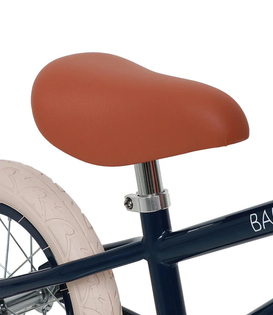 Bicicletta Banwood Balance Bike con telaio in acciaio verniciato, senza pedali, sellino regolabile con rivestimento in eco-pelle, manubrio regolabile con impugnature in eco-pelle, cestino in vimini staccabile. Bicicletta da 12 pollici.