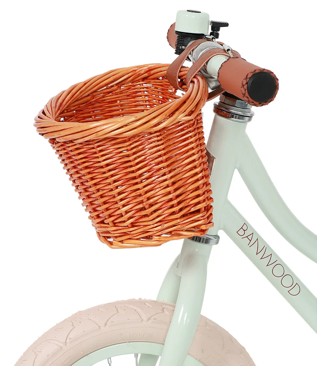 Bicicletta Banwood Balance Bike con telaio in acciaio verniciato, senza pedali, sellino regolabile con rivestimento in eco-pelle, manubrio regolabile con impugnature in eco-pelle, cestino in vimini staccabile. Bicicletta da 12 pollici.