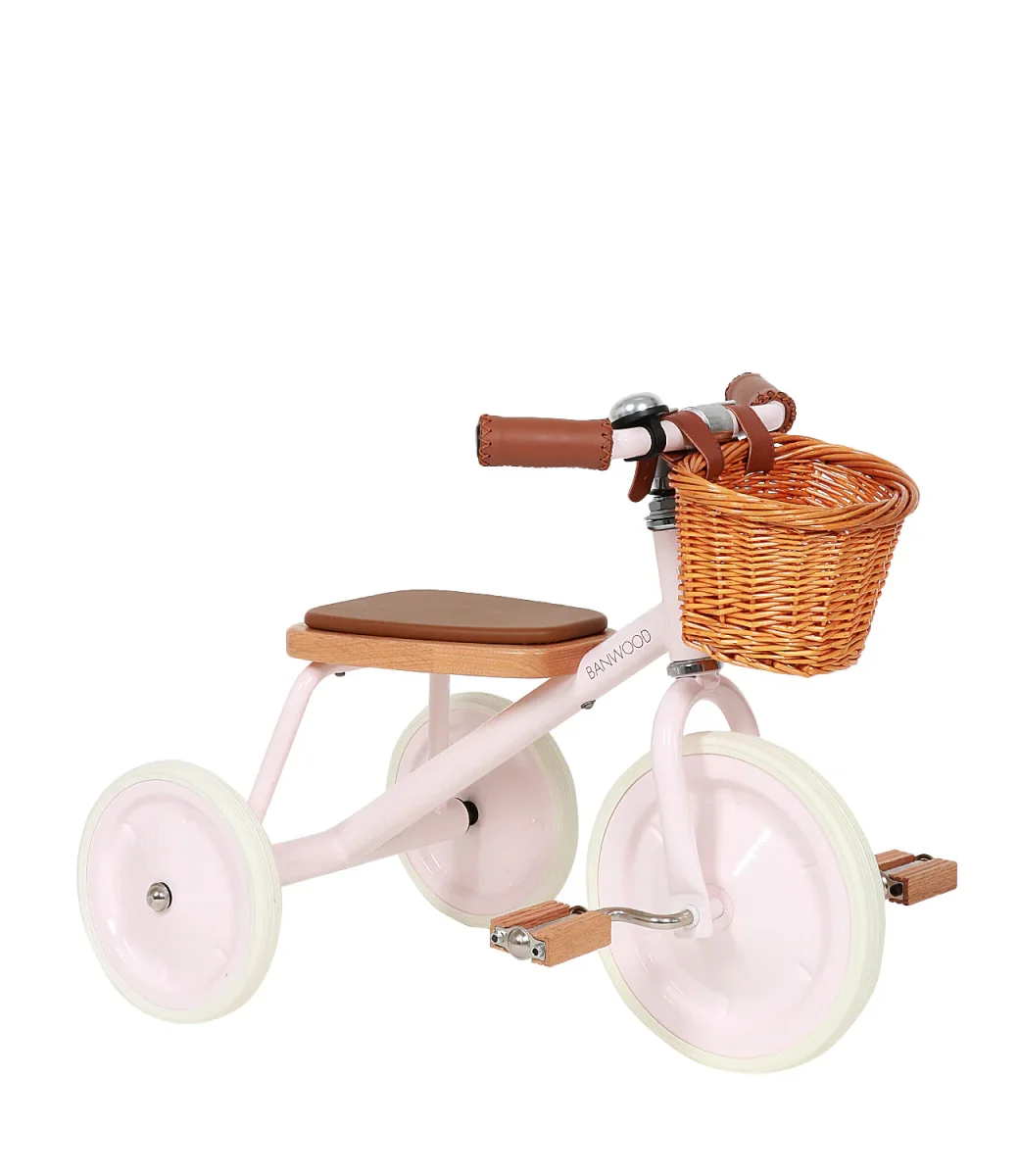 Triciclo Banwood Vintage adatto dai 2 anni, con un sedile in rovere morbidamente imbottito, pedali in legno di quercia e dettagli in eco-pelle. Cestino di vimini rimovibile.