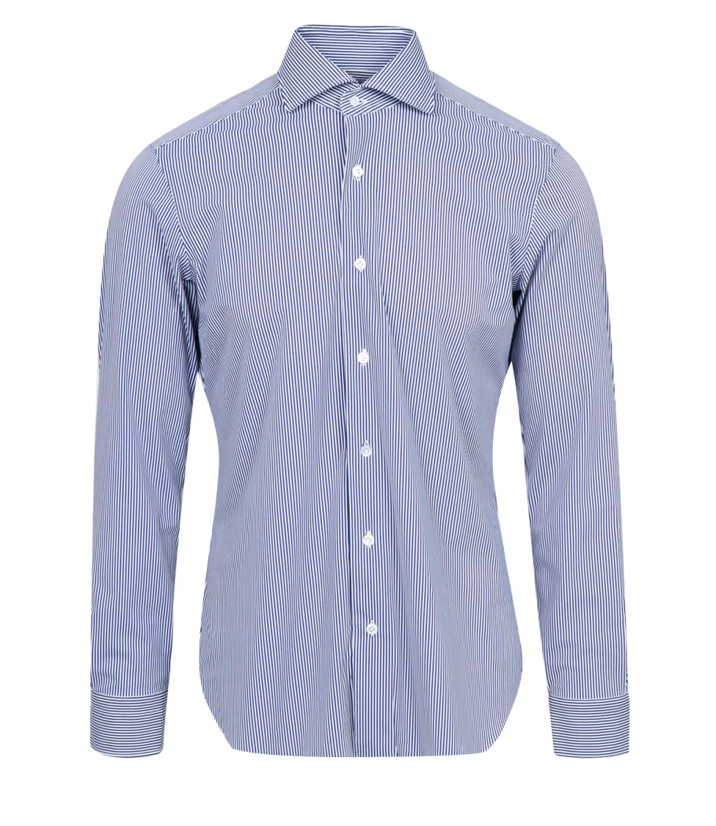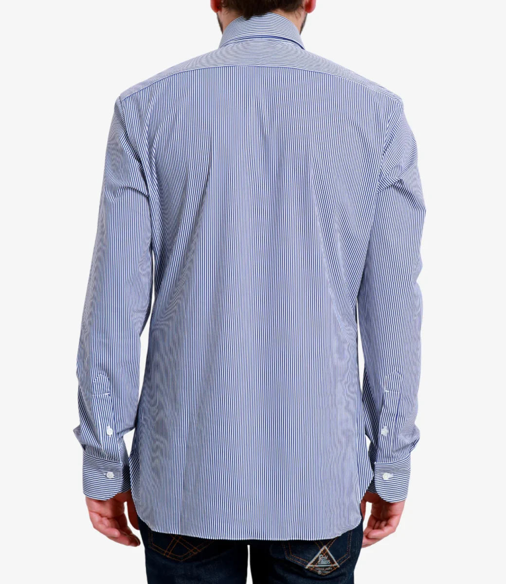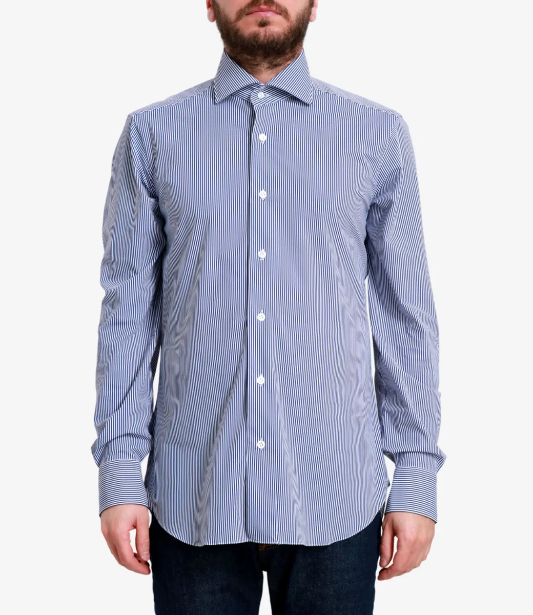 Camicia Barba realizzata in tessuto tecnico elasticizzato, al tatto simile ad un leggerissimo neoprene in fantasia a righe. Collo italiano classico, maniche lunghe con polsini e arrotondati sul finale con bottone. Chiusura con bottoni in madreperla, fondo stondato.