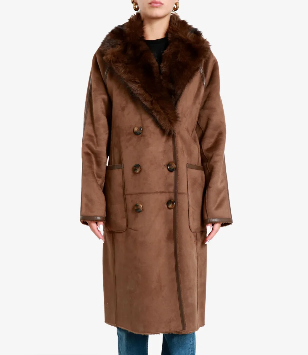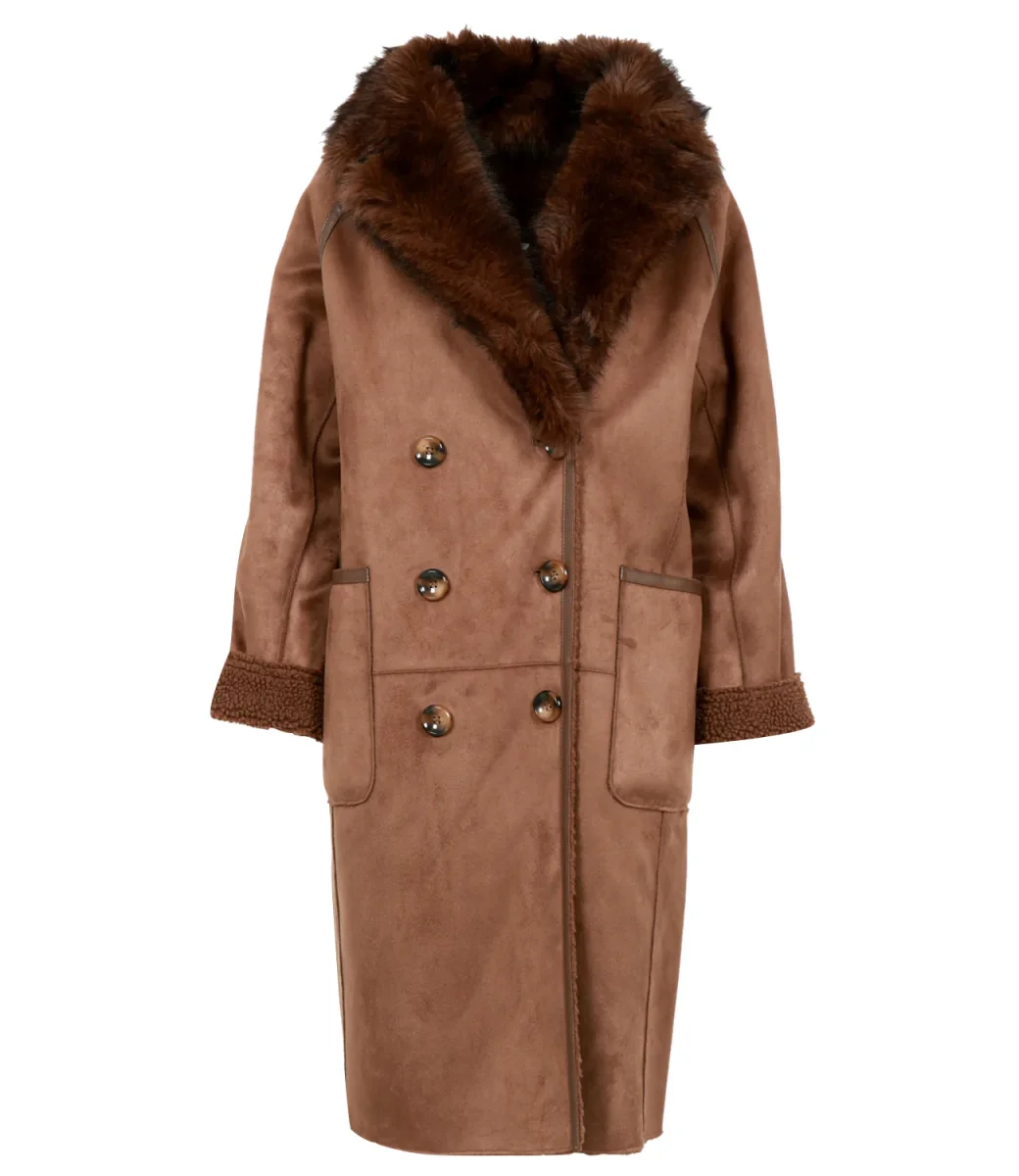 Cappotto Betta Corradi realizzato in montone ecologico interno in tessuto teddy, modello midi, doppiopetto con revers classici, tasche applicate sul davanti, cuciture in rilievo, profili taglio vivo.